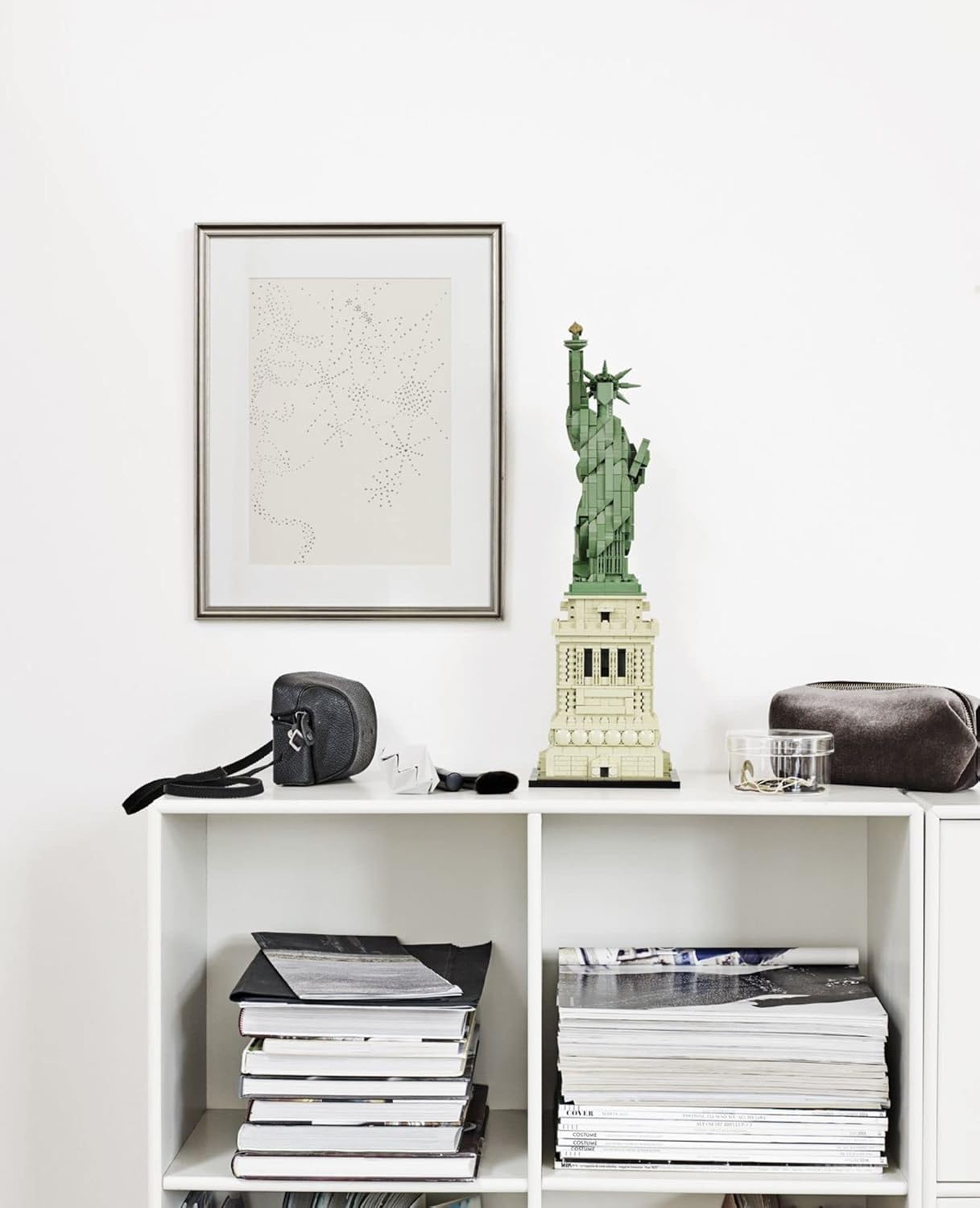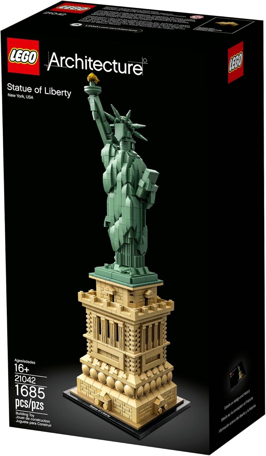 Celebrate a monumental blend of architecture and sculpture with this LEGO Architecture The Statue of Liberty collectable architecture model building kit (21042). America’s iconic symbol of freedom shines her golden torch more than 305 feet above Liberty Island in New York harbor, welcoming seafarers from around the globe. This impressive LEGO Architecture model faithfully interprets the monument’s harmonious blend of sculpture and architecture with its intricately detailed shield-lined pedestal, brick detailing, and columned balconies. The beautifully crafted Lady Liberty statue features the iconic flowing robes, broken shackles, tablet, 7-ray Statue of Liberty crown, and an upraised arm bearing a golden torch. Finished with an authentic sand-green and beige color scheme and a decorative nameplate, this collectable architecture model delivers a highly satisfying building experience. LEGO architecture model building kits make a truly symbolic centerpiece for the home or office, as well as a magnificent birthday or Christmas New York City gift for teens and adults. The Statue of Liberty sculpture measures over 17” (44cm) high, 5” (14cm) wide, and 5” (14cm) deep. Contains 1,685 Pieces.