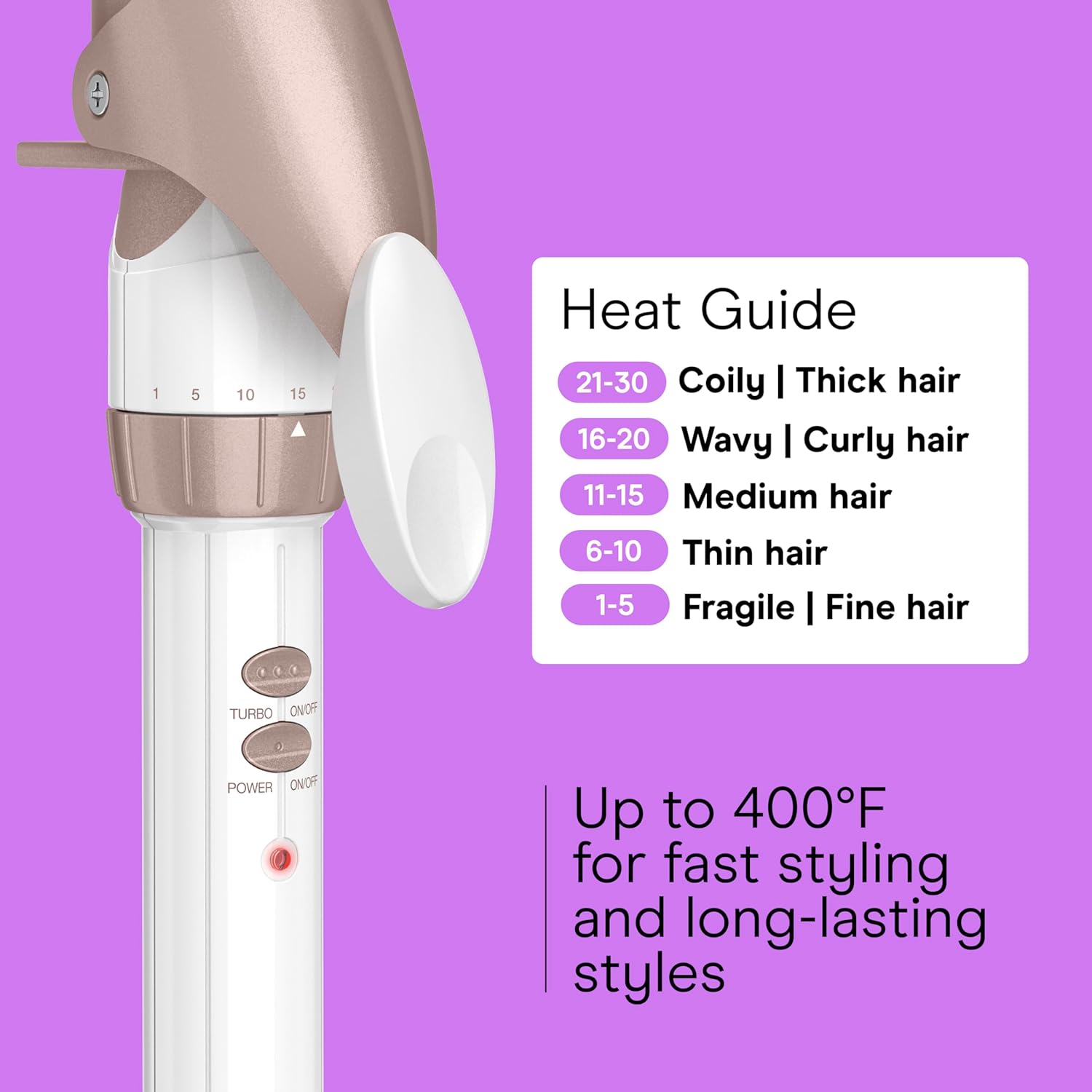 Voluminous curls and waves that last? Yes, please! The Conair Double Ceramic 1-1/2 Inch Curling Iron delivers curls and waves that hold up through whatever your day brings. This 1-1/2" curling iron helps you create everything from soft waves to loose curls with 30 heat settings up to 400°F and a Turbo Heat boost. This hair curler gives you the flexibility to style your way, no matter your hair type. A cool tip and auto off feature keep styling simple and worry-free. Grab this curling iron, wrap, and step out with curls that last.