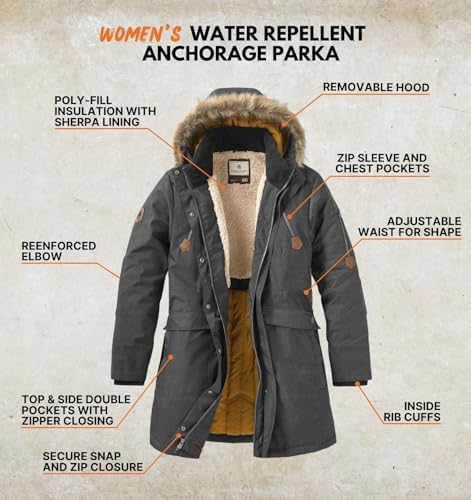 Zip-off removable hood with quilted interior and faux fur outer lining Finished with a water-resistant coating and sherpa lining for warmth Extra sturdy hook and loop hood flap Fashionable exposed zippers Reference the size chart image as the sizing of this jacket differs from the Amazon supplied size chart
