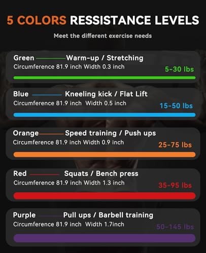 Suitable for Any Workout: Our pull up assistance bands offer effective training. Workout your arms, back, legs, and butt all at once with mobility band, perfect for body resistance training and physical therapy to help strengthen torn ligaments or muscles. Different bands are perfect for learning pull ups, Pilates, Mobility, Powerlifting, Chin ups, Yoga, Stretching, Gymnastics, physical therapy, push-ups, barbell and dumbbell assist etc. Durable & Environmental: Our assistance bands are 100% natural latex and are over 99.9% free of soluble proteins (latex allergens). It is more strong and can be used for a longer time than other competitors in the market. Specifications: Green(5-30 lbs), Best for speed barbell training and shoulder mobility. Blue(15-50 lbs), Prefect beginning bands for resistance training. Orange(25-75 lbs), Medium tension for resistance training and pull up assist. Red(35-95 lbs), Ideal for pull up assist, High tension for resistance and advanced banded barbell training. Purple(50-145 lbs), Ideal for pull up assist training,Powerlifting andstretching. Set of 5: A variety of bands make you can do more training you want. If you are a newbie, you need to start working out from the pull up assistance bands with the least resistance. As you get stronger you’ll need to lower the assistance to account for your new strength. You Will Get: 1x Green Band, 1x Blue Band, 1x Orange Band, 1x Red Band, 1x Purple Band, 1x Storage Bag, 1x User Manual. We also provide high-quality after-sales service and a lifetime warranty. Any problems or questions, contact us any time, we will help you solve in time.