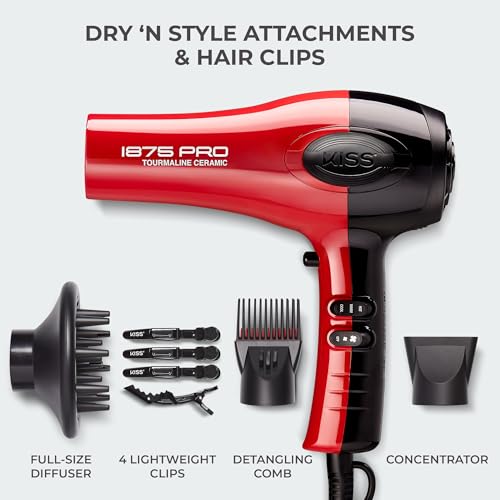 KISS 1875 Watt Pro Tourmaline Ceramic Hair Dryer, Styling Edition, 3 Heat Settings, 2 Speed Settings, Cool Shot Button, 7 Blow Dryer Accessories Included, 2-Year Warranty - Red