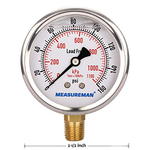 For pressure measuring of gas, liquid which is not corrosive to brass, also where vibration and pulsation is a concern. It is suitable for drinking water system. 2-1/2" dial size, 1/4"NPT Lower mount Pressure range: 0-160psi/kpa double scale, big letters, easy to read Stainless steel case, brass wetted parts, glycerin filled Accuracy: +/-3-2-3%