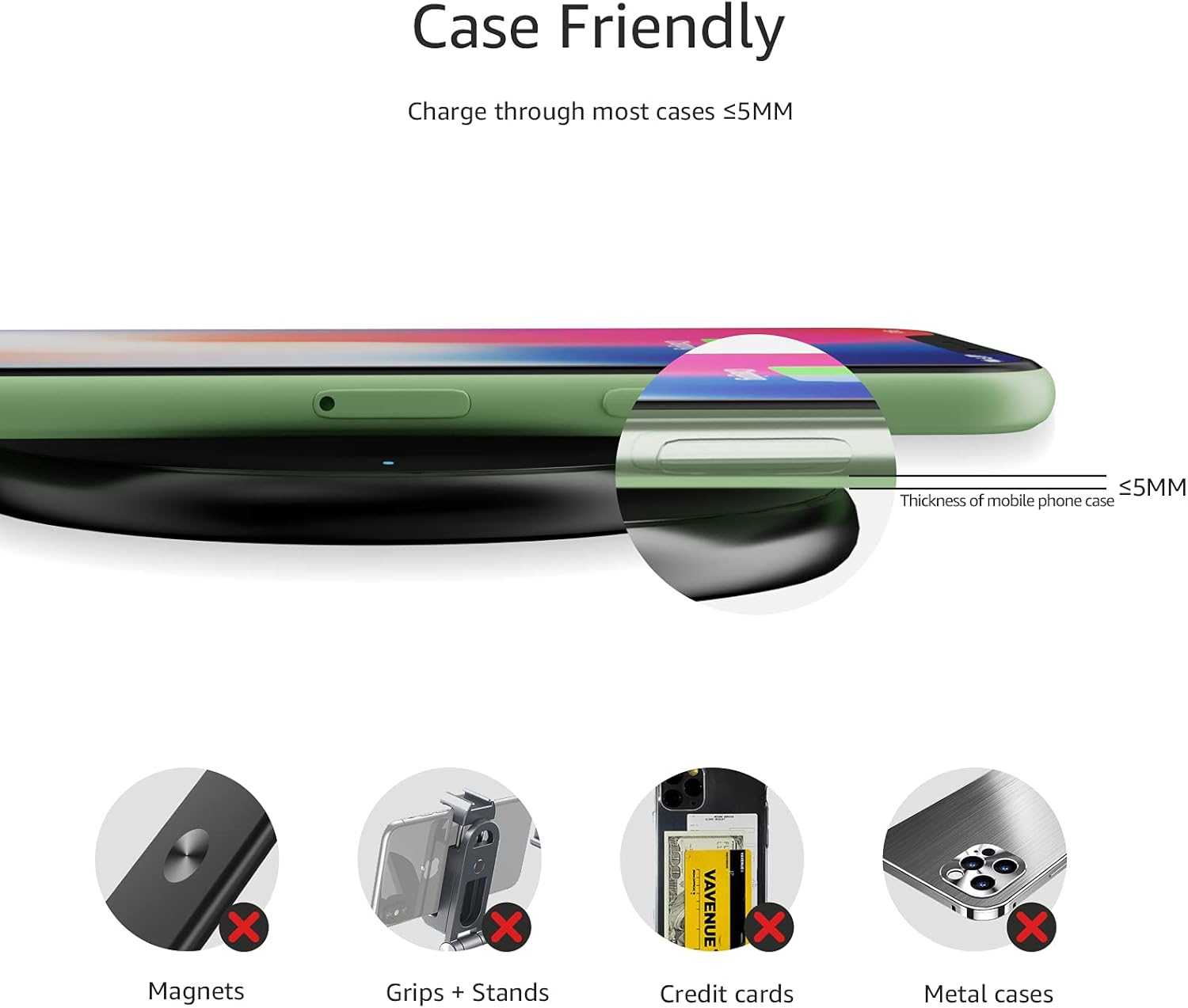 CASE FRIENDLY DESIGN: This wireless phone charger pad lets you conveniently charge without removing cases; power is transmitted through rubber, plastic, or TPU cases under 5mm thick. For faster charging with iPhone remove all cases before charging. Avoid charging with magnetic and metal cases or credit cards on; these cases will prevent operation