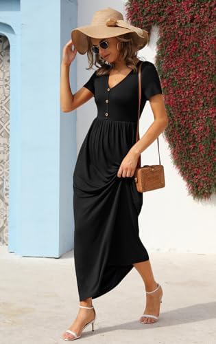 Fabric: 95% Rayon + 5% Spandex; casual maxi dresses for women selected stretch knitted fabric, cloud-like soft touch, can wrap your body well, close to wear will not itch, not tight, let your body breathe freely. No shrinkage, no color loss, no pilling. Comfortable and breathable, it is a close companion for your daily wear. Features: floor length maxi dress, very high length. Stretchy high waist, can well wrap and highlight your slim waist. The V neck can show your beautiful neckline and sexy collarbone.Buttons for embellishment, adding interest and making you look more lovely. Short sleeves are easy to move around and more suitable for spring and summer. Double side pockets for your small daily necessities.Such exquisite temperament goodies are your daily travel wear casual casual first choice. Size: Standard US size, you can buy according to your usual wearing habits. long dress US SIZE: S=(US 4-6), M=(US 8-10), L=(US 12-14), XL=(US 16-18), 2XL=(US 20). Fashion Tips: The classic and versatile basic maxi dress. It is easy to create a chic and casual street look with casual and fashionable shoes and bags. cold weather with a denim jacket or leather jacket is very cute. To attend parties, weddings, family events, dating and other important occasions, a pair of high heels, and then with necklaces, earrings and other accessories, delicate and timeless, as romantic and elegant. Easy Care: This dresses is easy to care for, and can be machine washed or dry cleaned. We recommend using a neutral detergent and avoiding bleach to maintain its quality.