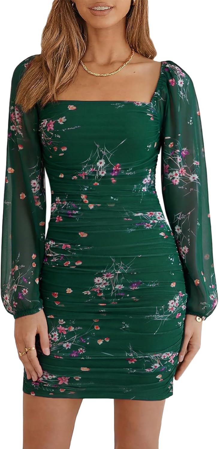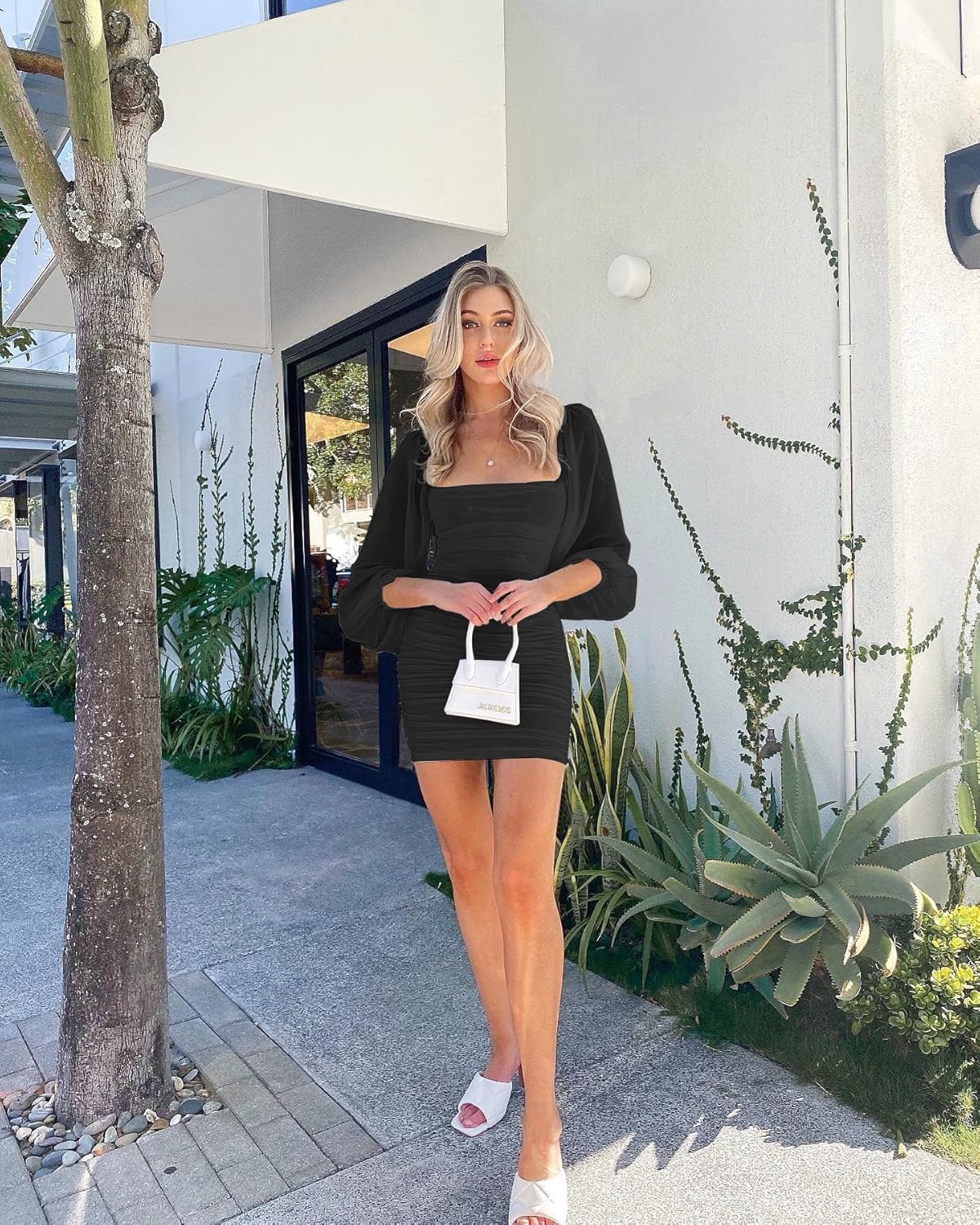 Wenrine Women's Mesh Long Sleeve Square Neck Ruched Party Club Cocktail Bodycon Mini Dress