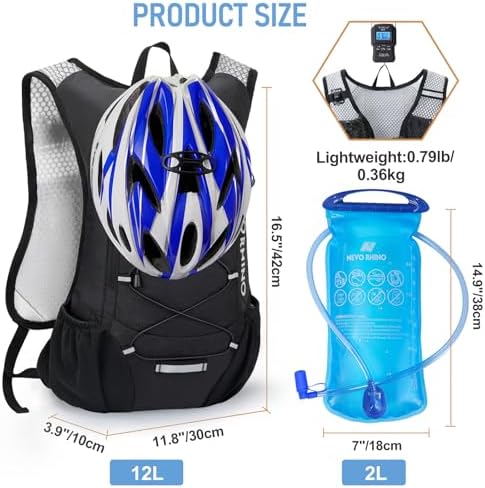 100% Nylon Imported Lightweight 12 L Hydration Backpack: Super lightweight 8.5 oz hydration pack backpack with 2 L water bladder. Waterproof and tear-resistant fabric, PU coated nylon hydration pack bears 25 lbs Leakproof & Anti-popping Water Bladder: Water backpack for hiking with 2 L bladder, BPA-free, food-grade PEVA material, and hose clamp. Leakproof bite value, water flows fast and never drips on when locked Comfortable & Breathable & Adjustable: Multi-adjustable shoulder straps on hydration Pack, adjustable to 19"-34" on should straps, 2.4"-7.9"on chest strap(up & down). Hydration packs are suitable for adults. Ergonomically fits for your shoulders, chest, and waist. Soft air mesh back speeds up the air flow and makes your back cool Thoughtful Storage Details: Running backpack bidirectional main zipper pocket for a water bladder, small storage compartments on front, two small mesh pouches for umbrella, mineral water, BlueTooth stereo, two mesh pouches on the shoulder on phone, and keys Multiple Use: Our hiking backpack with water bladder is suitable for hiking, running, MTB cycling, cycling, climbing, music carnival, and other occasions. This running hydration vest can be a are great companions for families and friends. N NEVO RHINO focuses on outdoor sports backpacks, and vitality blooms from here After sale: If you have any problems, please reach out to us, we will reply within 24hrs. (We provide replacement services for quality problems within 1 year and lifetime customer service)