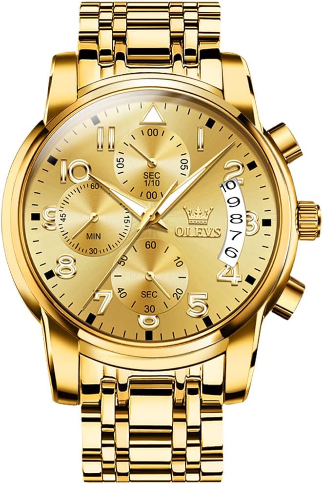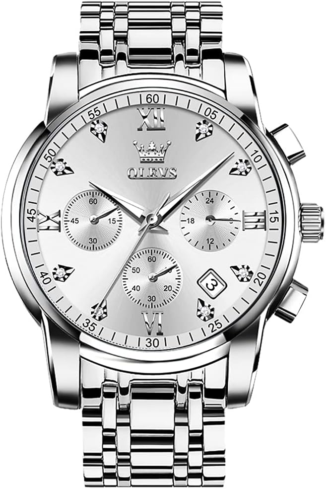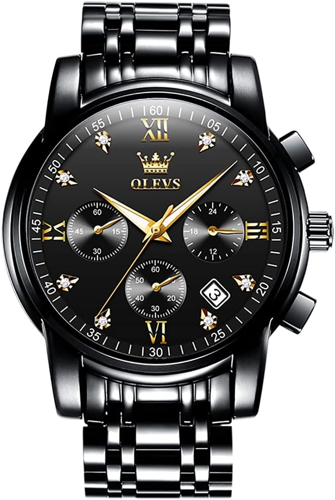 OLEVS Men's Stainless Steel Chronograph Watch, Big Face Gold Silver Black Tone Easy to Read Analog Quartz Watch, Luxury Waterproof Date Diamond Roman Arabic Numerals Dial Dress Watch for Men