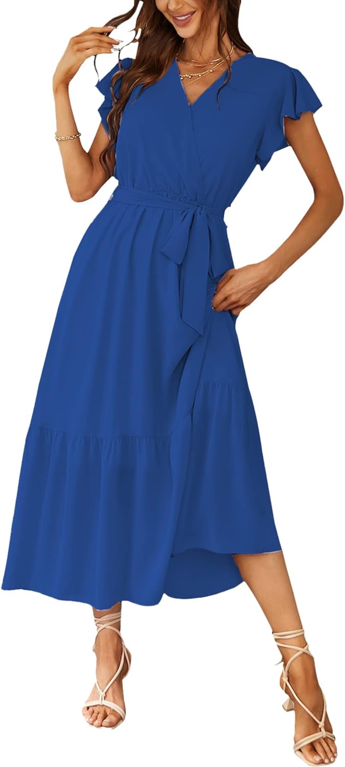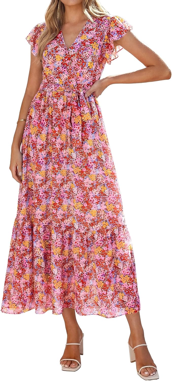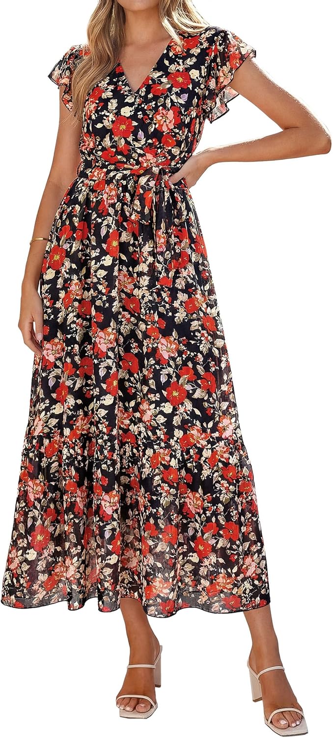 PRETTYGARDEN Women's Summer Floral Boho Maxi Dress Short Sleeve Wrap V Neck Ruffle Long Flowy Beach Wedding Guest Dresses