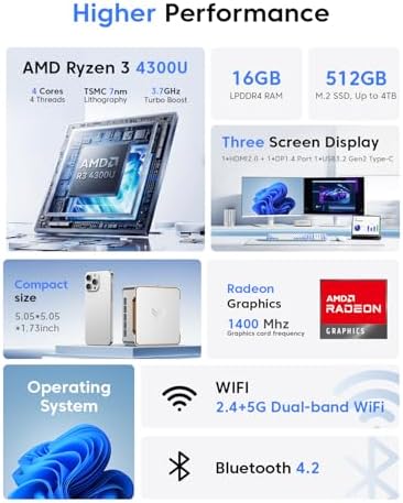 【AMD Ryzen 4300U True 4-Core CPU: Outperforms N95 & i3-10110U】KAMRUI P2 Mini PC is equipped with true 4-core AMD Ryzen 4300U processor built on advanced 7nm Zen2 architecture,This means you get consistent, unthrottled performance for hours on end, whether you’re running multiple browser tabs, streaming 4K content, or managing virtual machines. Compare that to Intel N95 (4 efficiency cores that throttle under load) or Intel i3-10110U (only 2 cores total), and the difference is night and day: The KAMRUI P2 AMD Ryzen 4300U (28W) is 40% faster than the Intel i3-10110U and 25% faster than the Intel N95 in multi-core tasks, ensuring smooth, lag-free performance even during heavy workloads. 【Integrated AMD Radeon Graphics: 2.5X Stronger for Tri 4K】The KAMRUI P2 AMD 4300U Mini PC have unlocked the full potential of the built-in AMD Radeon Vega 5 graphics with 28W power delivery, making it 2.5 times stronger than the Intel UHD graphics found in the N95 and i3-10110U. This means you can enjoy Tri 4K@60Hz displays without a single stutter, perfect for productivity setups, home theaters, or even light photo/video editing and casual gaming. While the Intel N95/i3-10110U struggle to run a single 4K display without lag, The KAMRUI AMD 4300U Mini PC handles Tri 4K effortlessly, turning your workspace into a high-efficiency hub or your living room into a premium entertainment center. 【Large Storage Capacity, Easy Expansion】KAMRUI Pinova P2 mini computers is equipped with 16GB LPDDR4 for faster multitasking and smooth application switching. 512GB M.2 SSD ensures fast startup, fast file transfers and plenty of storage space,eliminating slow loading times and ensuring fast responsiveness. the two storage slots (1x M.2 2280 SATA/NVMe PCIe3.0 slot, 1x M.2 2280 SATA slot) can be combined to provide up to 4TB of total storage(Not included). This gives you enough space for all your projects, media and data. 【4K Triple Display】KAMRUI Pinova P2 4300U mini desktop computers is equipped with HDMI2.0 ×1 +DP1.4 ×1+USB3.2 Gen2 Type-C ×1 interfaces for faster transmission, Triple 4K@60Hz Display, KAMRUI P2 mini computer is ideal for visual home entertainment, home office, conference rooms, etc. USB3.2 Gen2 Type-A port ×2 with a transfer speed of up to 10 Gbps (21 times faster than USB 2.0) for efficient data transfer. Ideal for seamless multitasking between spreadsheets, browsers and presentations, or for an immersive entertainment experience. 【USB3.2 Gen2 Type-C 10Gbps, Versatile connectivity】KAMRUI P2 mini desktop pc fast and versatile connectivity! The USB3.2 Gen2 Type-C port offers a data transfer rate of 10Gbps and simultaneously supports DisplayPort 1.4 video output. The P2 AMD Ryzen 4300U Mini PC is complemented by Gigabit LAN, WiFi and Bluetooth, so nothing stands in the way of a productive working environment. 【Save space & High efficency cooling system】The portable small pc features a silver case and can be stored in a bag and carried with you at any time, ideal for business trips. Save space by supper mini size(5.05x5.05x1.73 inch) and a VESA mount to install it on wall or monitors. The shape of the P2 has been recently improved, improving heat dissipation and enabling continuous and stable operation of the micro pc. The cooling fan is practically silent at light load and even under load, the fans remain fairly quiet; minimal or inaudible fan noise is perfect for concentrating on the task at hand! 【Why KAMRUI? Reliable Technical Support & Warranty】We offer lifetime technical support and 12 months satisfaction service. For all our KAMRUI products, please contact our professional service if you have any problems, KAMRUI will do everything to provide satisfactory service. Brand: KAMRUI, Model: P2, Manufacturing Company: Shenzhen CYX Industrial Co., Ltd.