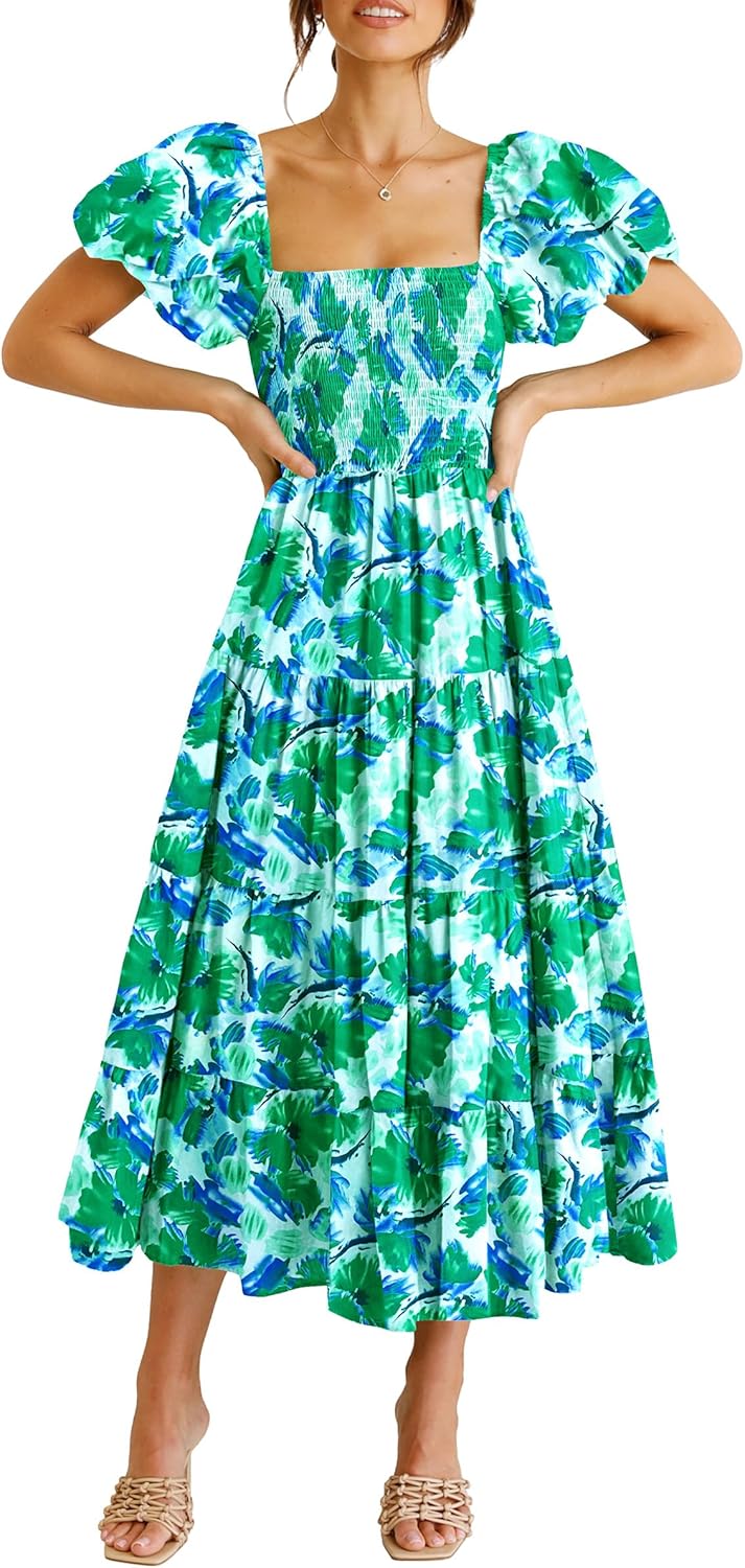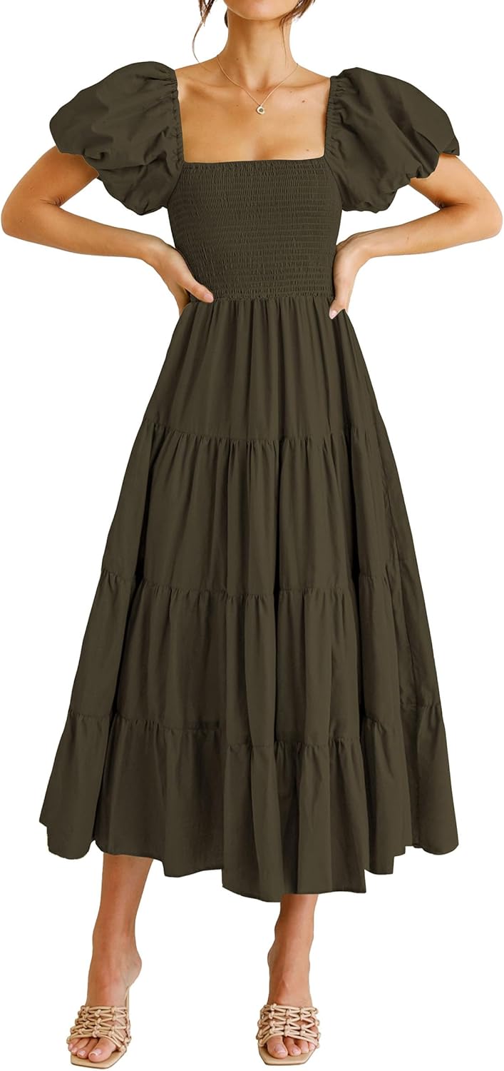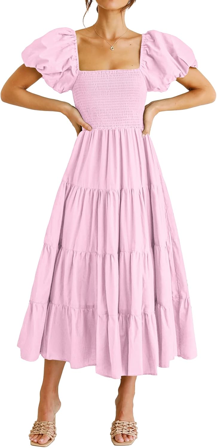 PRETTYGARDEN Women's Casual Summer Midi Dress Puffy Short Sleeve Square Neck Smocked Tiered Ruffle Dresses