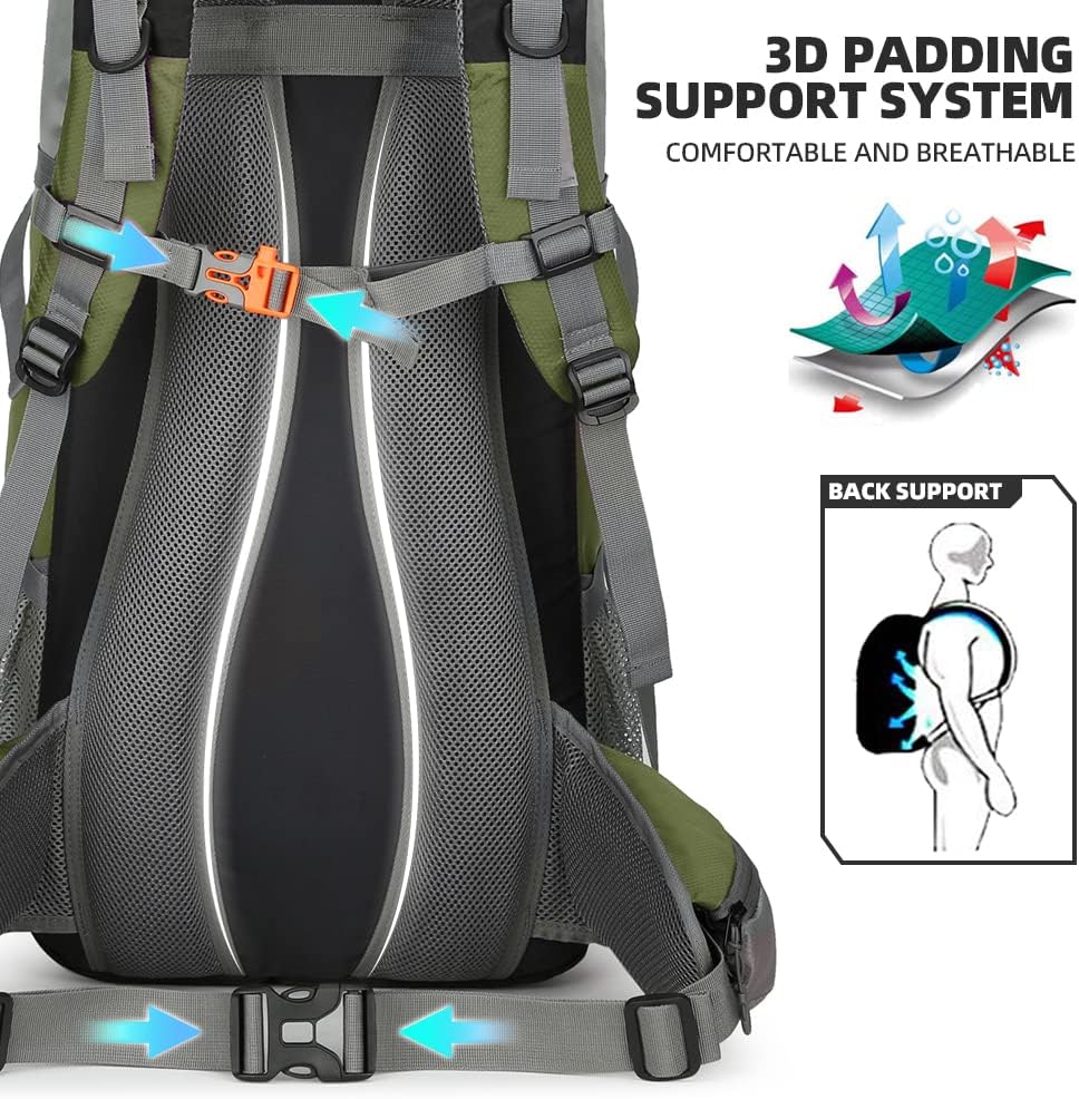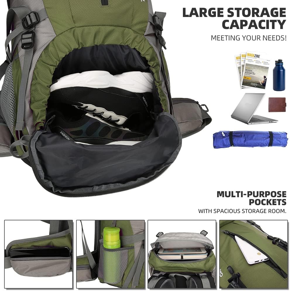 【Waterproof Backpack】The backpacking backpack made form waterproof nylon material and come with extra rain cover on the bottom pouch, double protection, prevent the water and dust into the backpack, protect your valuables from heavy rain and keep everything dry.