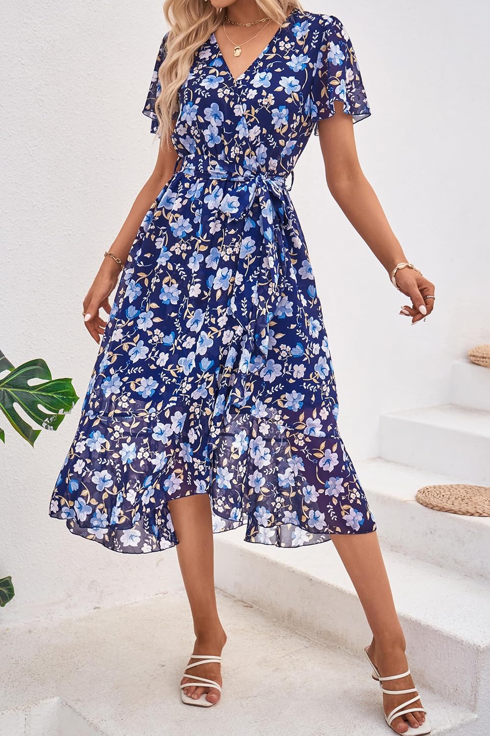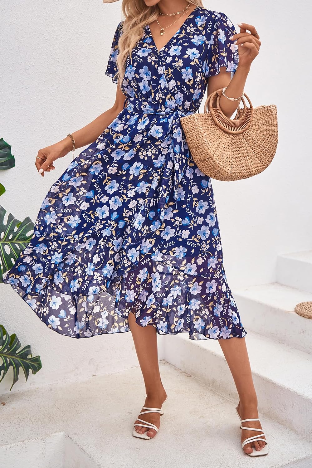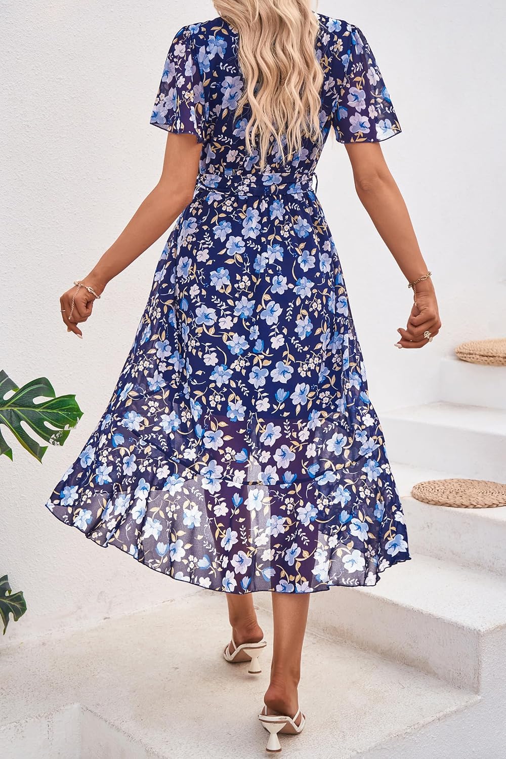 PRETTYGARDEN Women's Summer Floral Boho Maxi Dress Short Sleeve Wrap V Neck Ruffle Long Flowy Beach Wedding Guest Dresses