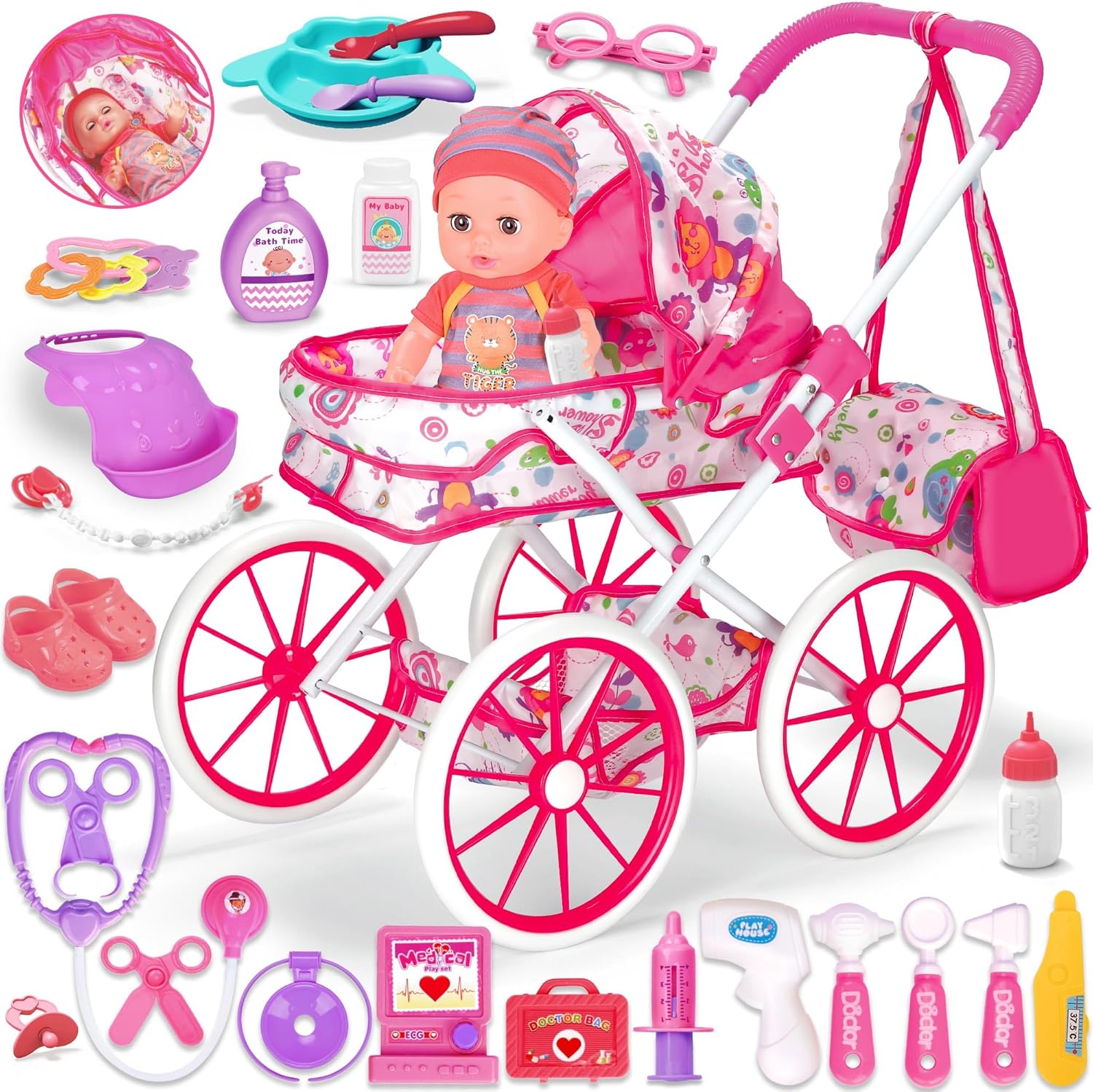 Baby Doll Toys Set, 14" Doll Toys, 25Pcs Dolls Care Toy Playset, Toddlers Toy Dolls Set Incl Cradle Crib, High Chair, Milk Bottle, Pacifier, Diaper, Baby Gift for Age 3 4 5 6+ Years Old Girls Boys