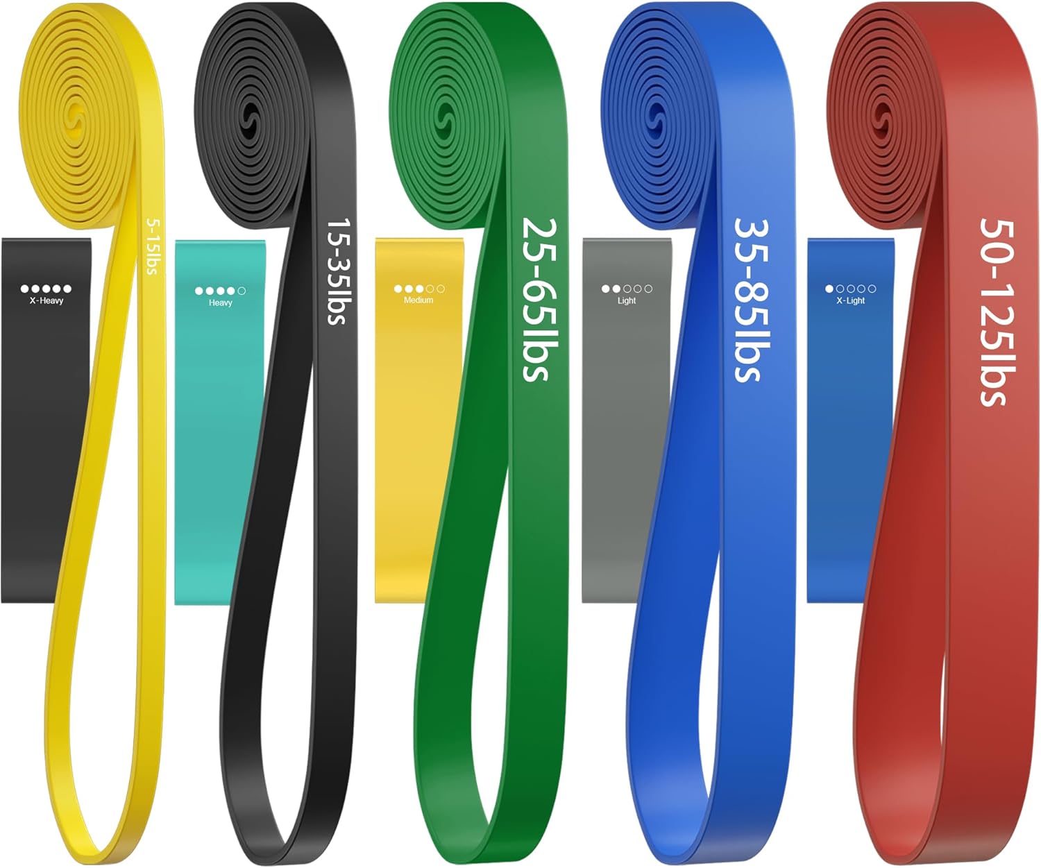 Package Included: 5 pull up bands, 1 carrying bag and 1 workout guide. Resistance bands are 5-15 lbs,15-35 lbs, 25-65 lbs, 35-85 lbs, 50-125 lbs. Use these exercise bands to perform rows, pulls, raises, and fly workout sets to exercise your arms, back, hips, legs, chest, and abdominal region