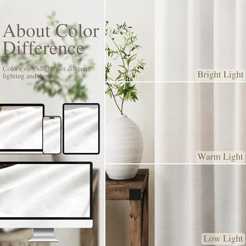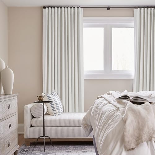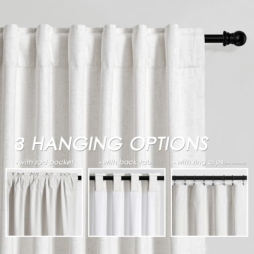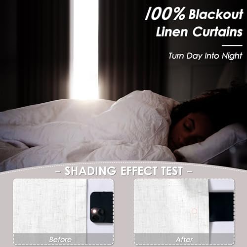 100% BLACKOUT: The blackout coating is attached directly to the back of the linen drapes. Opaque fabric totally blocks out light to darken any room for your better sleep, protects the floors and furniture from color fading and reduces noise from the outside. Ideal for bedroom, living room, nurseries, home office, playroom. MATERIAL: These linen blackout curtains are crafted from 30% linen blend fabric with 100% blackout white liner on the back. Slub weave fabrication has visible linen flecks for a natural, textured and aesthetic look. Lightweight coating help to block out sunlight and keep the linen curtain panels draping enough. Textured Linen draperies in neutral tone add a refreshing charm to your window THERMAL INSULATED & ENERGY SAVING: These cream blackout curtains can block sunlight in summer to keep the room cool, and act as a barrier in winter to prevent heat loss from the room while blocking cold winds from blowing in thus cutting your budget. Classic and timeless look make your room full of natural and fresh feeling. Perfect for a shabby chic, modern farmhouse, country chic, rustic, country, vintage READY MADE: Set of 2 ivory Linen Blackout Curtain Panels per package.Each panel measures 52 inches wide by 84 inches long. Top design of Back tab & loop pocket provide 3 hanging options. Hanging the blackout linen curtain panels from the back tabs for an elegant pleated style or use the rod pocket to create a more casual gathered look.use clip rings for easy slide open and closed (clip rings are not included) EASY CARE: Machine washable in cold water, use only non-chlorine bleach when needed, tumble dry low and cool iron on front side as needed. To better protect the coating, avoid using the dryer.