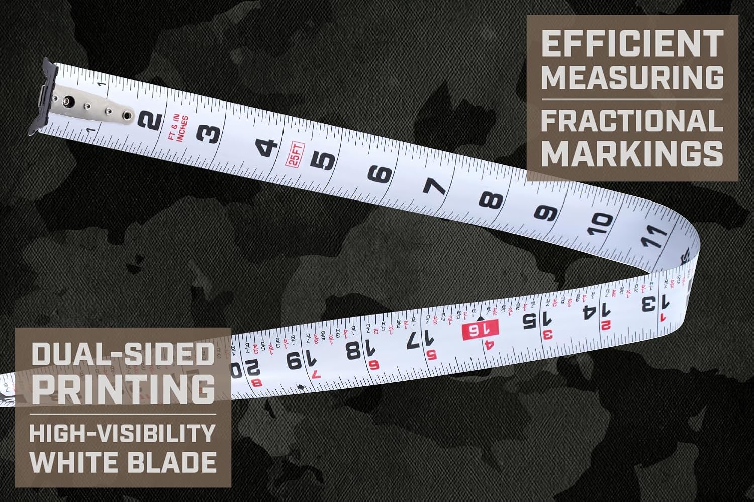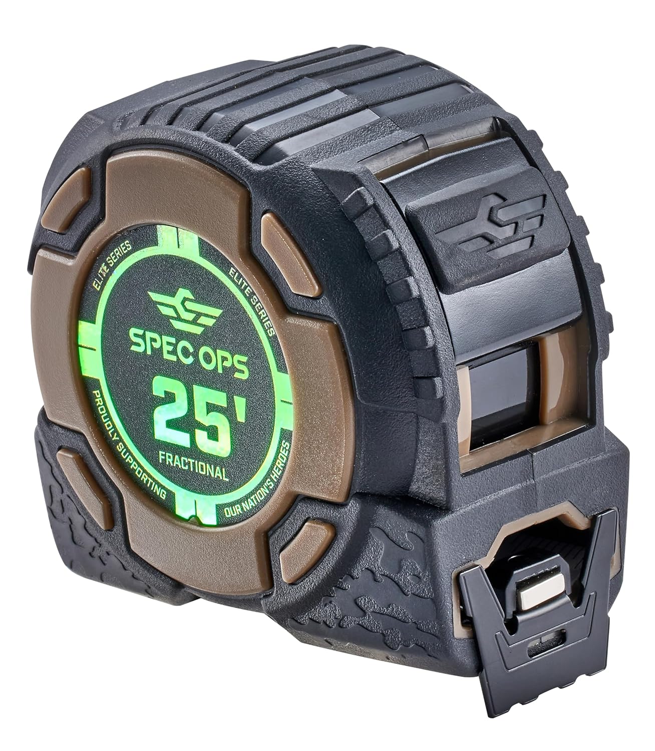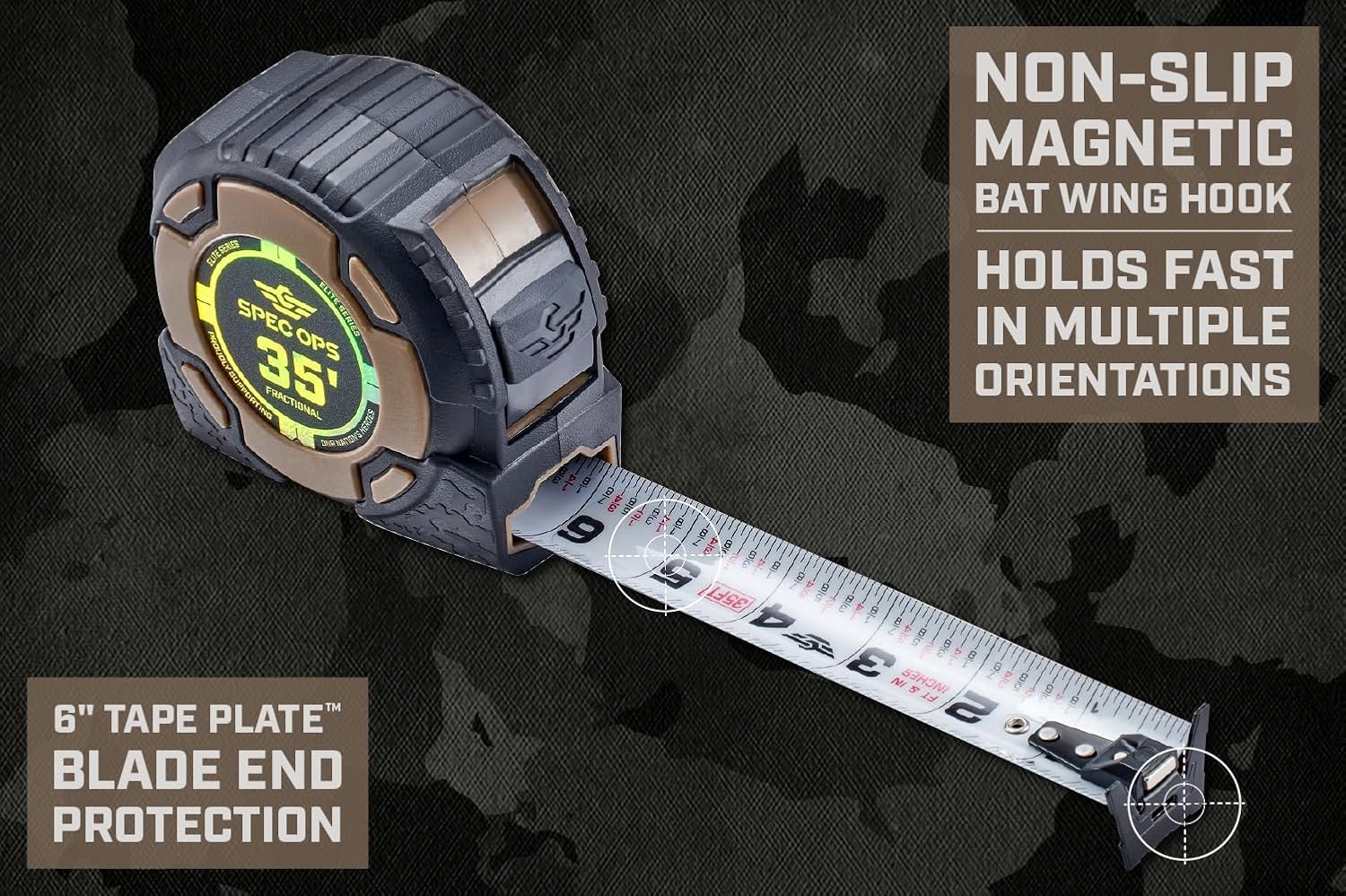 At Spec Ops Tools, we've engineered the ultimate Magnetic Elite Series Tape Measure, meticulously designed to excel in the most demanding professional settings. This Elite Series tool is not only engineered to withstand 200' drops onto packed dirt, guaranteeing exceptional performance on the world's most challenging job sites, but it also boasts a remarkable 12' NO BS Standout at 15° for a remarkable 15' of reach in real-world job site applications. Efficiency is paramount in the professional world, and that's why we've equipped it with a dual-sided printed blade featuring fractional markings, streamlining measuring and layout work while saving valuable time on the job. For low-light conditions or for those with less-than-perfect eyesight, we've prioritized visibility with a high-contrast, black-on-white printed blade, ensuring easy reading in any situation. Uncompromising durability is a standard we uphold, evident in the inclusion of 6"" of Tape Plate™ blade end protection and a MIL-X hyper tough nylon-coated blade, offering high abrasion resistance and 2X blade durability for a long-lasting tool. Safety is paramount for professionals. Our powerful Magnetic Hook, featuring rare earth magnetic technology, securely grips onto ferrous metals, providing an extra level of convenience on the job. The non-slip bat wing hook holds fast in multiple orientations, and it's compatible with the SRS retention system and wrist lanyard for added safety. We've also integrated the Secure Fast™ blade lock for seamless operation. Backed by our Spec Ops Five-Star hassle-free limited lifetime warranty, you can trust in the enduring reliability and performance of this Elite Series magnetic tape measure. We are dedicated to excellence and proudly support those who serve our nation, donating 3% of our proceeds to veteran and first responder causes with every purchase.