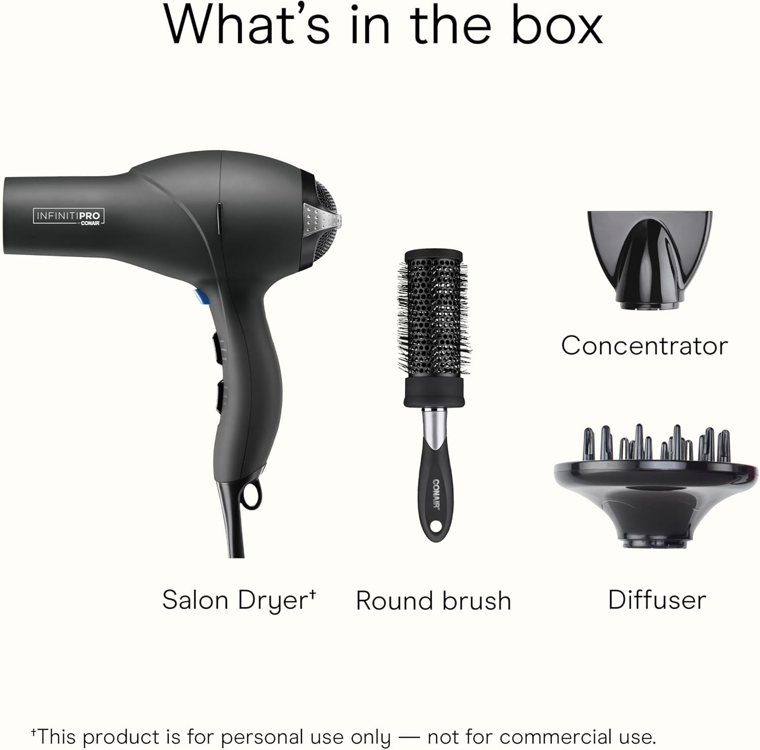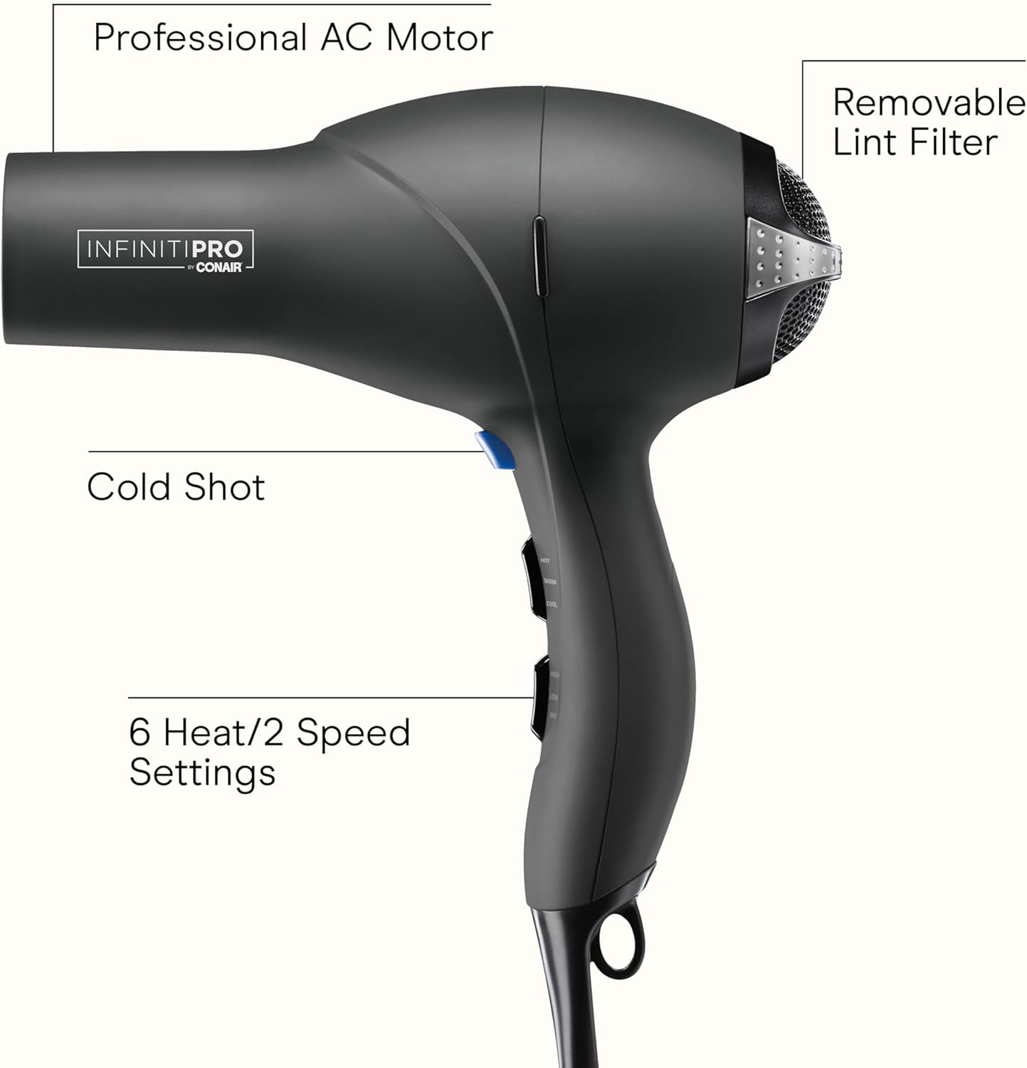 Meet your new styling essential. The INFINITI PRO CONAIR Hair Dryer delivers powerful performance in a lightweight design. This blow dryer uses tourmaline ceramic technology to help protect your hair and dry it quickly with less damage while reducing frizz and boosting shine for smooth, healthy-looking hair. The professional AC motor provides strong, even airflow and lasts up to 3x longer than standard Conair motors. With 3 heat settings, 2 speeds, and a cool shot button to lock in your style, this blow dryer lets you switch up your look or customize your style with confidence. The hair dryer with diffuser attachment enhances curls for added volume, while the concentrator delivers a sleek finish. A bonus blowout brush makes at-home styling effortless. The INFINITI PRO CONAIR hair dryer makes everyday styling simple and brings salon-quality results to your routine.
