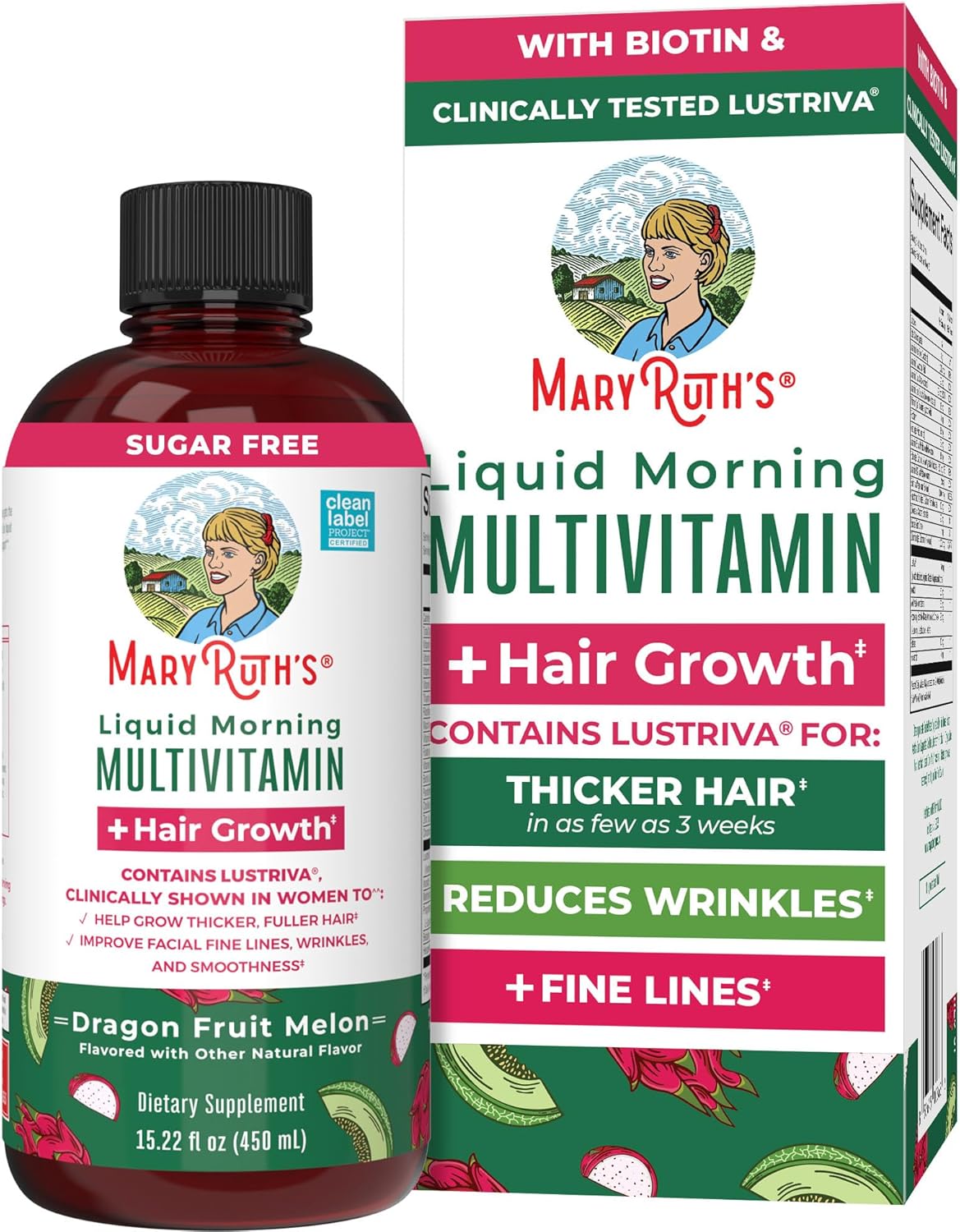 MARYRUTH'S Liquid Multivitamin+Hair Growth | Biotin 10000mcg | Lustriva Hair Growth Supplement | Clinically Tested in Women for Thicker Hair&Facial Wrinkle | Skin Care | Ages 18+ | 15.22 Fl Oz