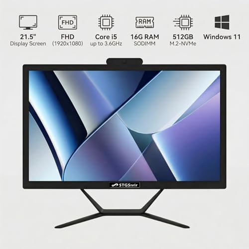 This All in One desktop computer adopts an integrated design. This All-in-One computer is well-suited for a variety of tasks including study, home, business, photo and video editing, streaming, day trading, crypto trading, and more. STGSivir All in One Computer comes with a 21.5" large screen with 1920*1080P FHD, clear and natural picture quality, fully retains picture details, and presents high-definition images, Built-in webcam makes it freely to share. All in One desktop computer System: Intel Core i5 up to 3.6GHz | 16GB Memory | 512 GB Solid State Drive | Genuine Windows 11 Home 64-bit All in One desktop computer Connectivity: USB 2.0 | 1x RJ-45 | Built-in Wi-Fi & Bluetooth 5.0 | 1x HDMI | 1x VGA All in One PC Special feature: RGB Mouse & Keyboard | Built-in Speaker | Built-in Webcam | 1 Year parts & labor | Free lifetime tech support