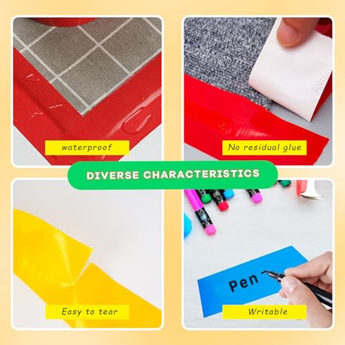 APPLICATION:SIKEDEPRO Duct Tape finds extensive applications in various settings such as homes, schools, kindergartens, offices, shops, warehouses, exhibitions, and more. It is used for organizing cables temporarily, securing pipes, carpets, advertising or decorative materials on floors, repairing furniture and sports equipment, marking warning signs or special areas on floors, coloring moving boxes, bricks, and toys, sealing packing, undertaking DIY projects, creating project progress tables and charts, styling cloth, and much more. With its versatility, SIKEDEPRO Duct Tape is an indispensable daily essential. FEATURES: This industrial-grade duct tape boasts premium quality and heavy-duty performance. Featuring a strong adhesive with one side coated in butyl silicone, it can withstand peel-strength of up to 18N/IN and pull-strength of up to 65N/IN. UL lab tested for high performance across various materials including metal, cloth, leather, tile, plastic, concrete, marble, rubber, vinyl, wood, and more. It leaves behind no residue upon removal and is abrasion-resistant, making it suitable for both short-term and long-term use. Our all-weather colored duct tape, featuring a waterproof and residue-free design, is perfect for various tasks such as sealing, waterproofing, and winterizing your home. It's also ideal for hanging plastic sheeting and conducting emergency repairs. With its extra strength and all-natural adhesive, our duct tape ensures that no residue is left behind after use. Safety is a top priority with SIKEDEPRO Duct Tape, crafted to resist dust, odor, damage, and residue while ensuring easy installation. Tear it horizontally or vertically by hand and apply directly to surfaces without the need for any special pre-treatment. Assorted Colored Duct Tape: This pack includes 6 rolls of multicolored duct tape, each with a width of 2 inches and a length of 15 yards. The colors included are blue, yellow, red, green, orange, and purple, creating a vibrant rainbow assortment. Perfect for crafts, arts, painting, or other projects and activities, this varied tape collection stimulates kids' imagination and creativity while enhancing their color recognition skills.