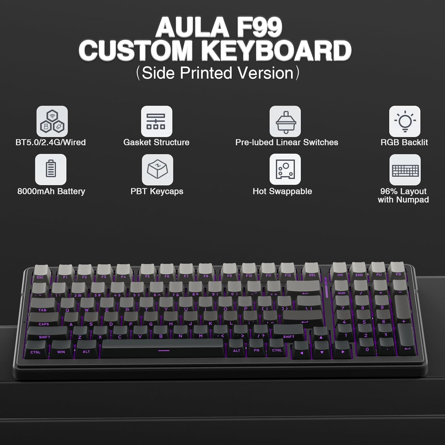 AULA F99 Wireless Mechanical Keyboard,Gasket Structure Hot Swappable Custom Keyboard,RGB Backlit,Creamy Sound,Side Printed PBT Keycaps,2.4GHz\/USB-C\/BT5.0 Computer Gaming Keyboards