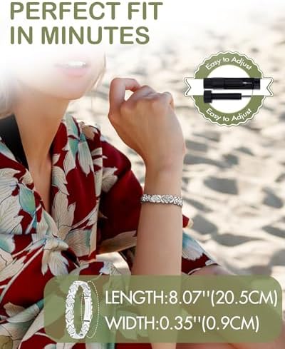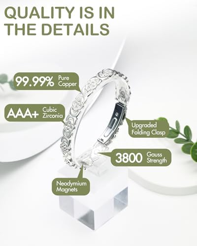 ENHANCED STRENGTH: This copper bracelets for women boasts neodymium magnets, the most powerful available at 3800 gauss. EFFORTLESS CONVENIENCE: The upgraded folding clasp makes it a breeze to put on and take off the bracelet with just a light press on both sides. No more accidental losses! EMBRACE LUCK AND LOVE: This magnetic bracelets for women seamlessly blends a four-leaf clover with an infinity symbol, embellished with sparkling cubic zirconia. It's a timeless piece symbolizing endless luck and love. ADJUSTABLE & COMFORTABLE: Arriving at 8.07"(20.5cm) long & 0.35"(0.9cm) wide, this copper magnet bracelet comes with a sizing tool for a customized fit. Made from 99.99% solid copper, it's hypoallergenic, lead and nickel-free. THE PERFECT GIFT: Surprise your loved ones with a luxurious bracelet that combines style and function. Comes in an elegant gift box, making it the ideal gift for friends and family.