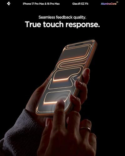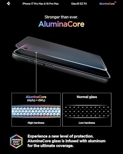 Superior Screen Protection: Made from new AluminaCore glass for the best ultimate screen protector against daily drops and scratches New AluminaCore Technology: High-purity alumina-silicate glass undergoes a ion exchange strengthening process to maximize protection Natural Touch and Clarity: Experience fast touch sensitivity with zero lag and total light transmittance for an ultra clear display Easy Guided Installation: Includes 2 EZ Fit screen protectors and installation kit for quick guided installation Compatible with iPhone 17 Pro Max screen protector, iPhone 16 Pro Max screen protector, and designed precisely to fit in Spigen Cases