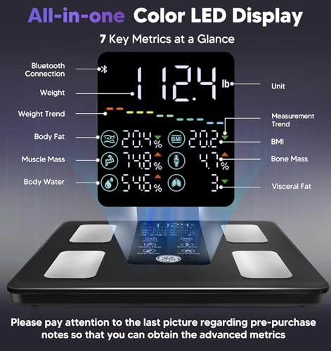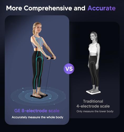 COMPREHENSIVE AND HIGHLY ACCURATE: The GE smart scale utilizes 8-electrode dual-frequency and segmental BIA technology, segmenting the body into five sections(four limbs and torso) for precise measurements to provide you with more accurate and comprehensive body composition data 50 BODY COMPOSITION METRICS: The GE body fat scale measures not only weight but also BMI, body fat, muscle mass, body water, bone mass, protein, visceral fat, BMR, skeletal muscle, subcutaneous fat, fat-free body weight, metabolic age, etc 7 METRICS SHOWS ON DISPLAY: The weight scale with body fat and muscle mass is equipped with an HD LED display, showing 7 key metrics including weight, BMI, body fat, body water, muscle mass, bone mass, and visceral fat. Once the Fit Profile app is downloaded and the initial setup is completed, these metrics can be viewed directly on the scale's display, eliminating the need to open the app each time. It makes health monitoring easy and convenient, great for personal or gym use USER-FRIENDLY APP FOR TRACKING AND SHARING: The free app Fit Profile provides detailed charts and saves historical body data so you can track the changes of your body composition over days, weeks, months, or years. Easy to set up and works with fitness apps including AppIe Health, for Fitbit, Google Fit, and you can also share your body data changes with your friends and family UNLIMITED USERS: The GE body composition scale has a large weighing surface measuring 12.2 * 13.2 * 1.3 inches (310 * 336 * 33.8 mm). It supports unlimited users and up to 9 profiles can be created, and it instantly recognizes the user when they step on the scale, perfect for families and fitness groups who want to monitor their body data to improve their health Precautions: Do NOT use if you have a Pacemaker or any other internal medical device in your body or are pregnant Note: If you notice a significant weight discrepancy, it may be because the scale was not calibrated to zero before use. Please step on the scale and then step off, wait until it displays zero, and then take the measurement.