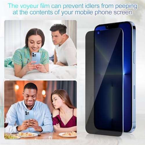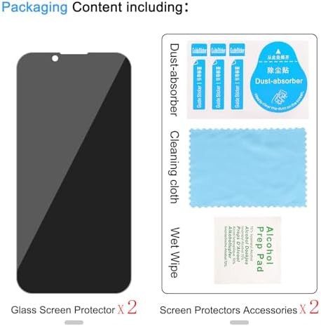 【Compatible with iPhone 13 Pro/ iPhone 13/ iPhone 14】Include 2 Pack Tempered Glass Privacy Screen Protector for iPhone 13 Pro/ iPhone 13/ iPhone 14. Please check your phone model before purchase. 【Privacy Protection】 Privacy glass screen is only visible to person who is directly in front of Screen. Protect your personal privacy effectively. 【Case Friendly】Compatible with most mobile phone cases. 【Easy Installation】 A handy installation tray is provided for your easy quick installation, not easy to fall off, no bubbles. 【Superior Quality】9H hardness privacy screen protector resists accidental drops and impacts. Light transmittance of 99.9%, maintain original touch experience and HD screen.