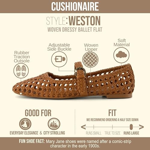 CUSHIONAIRE Weston Hand Woven Mary Jane Flats for Women, Comfortable Dressy Ballet Flats with Braided Adjustable Buckle and Memory Foam Cushioning