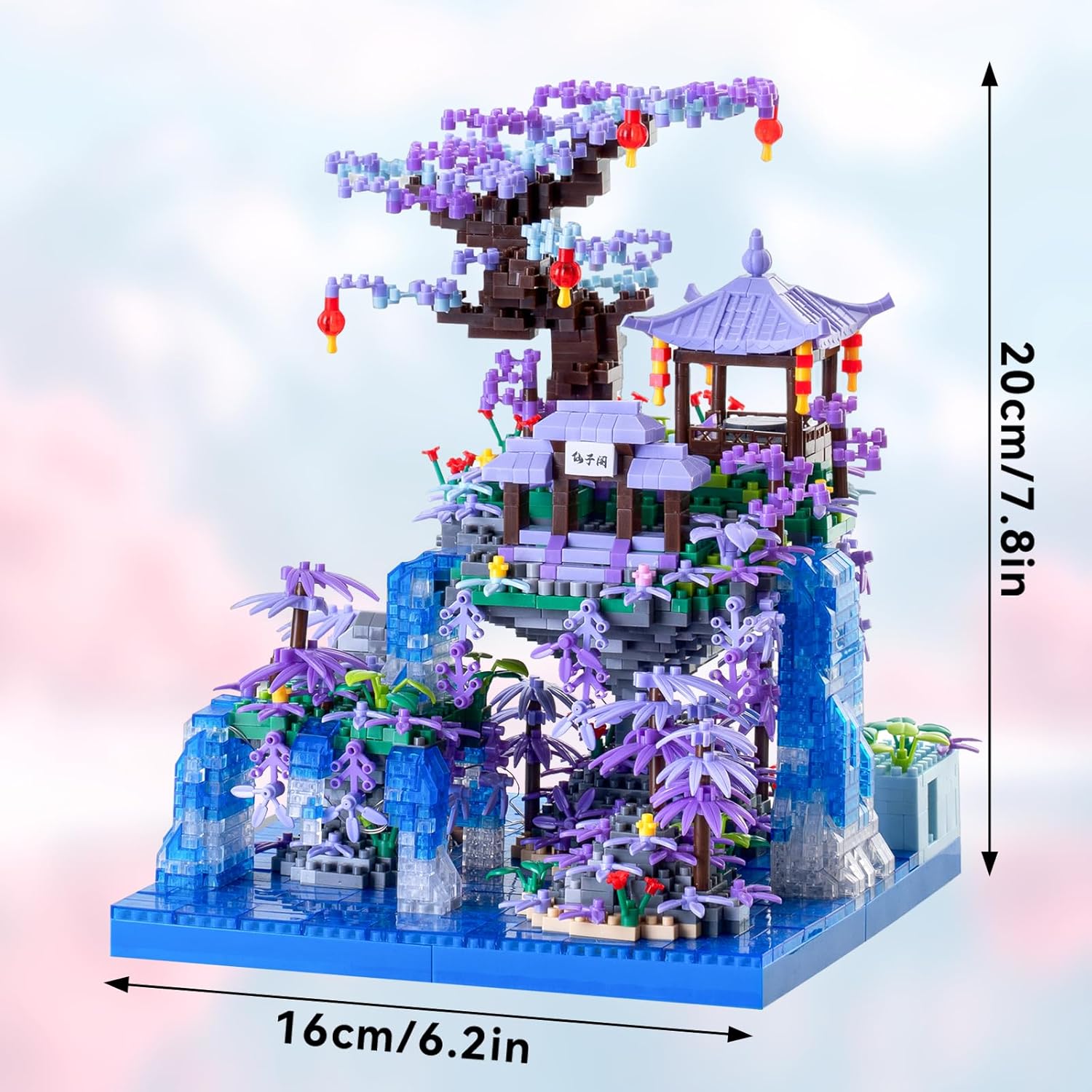 Small particle assembly to create a dreamy fairyland:The Fairy Pavilion building block set adopts an exquisite small particle design, making each block carefully carved and tightly pieced together to create a stable and delicate model. The set includes elements such as waterfalls, peach trees, and courtyards. Through clever assembly and combination, it perfectly presents a light purple fairyland full of fantasy colors