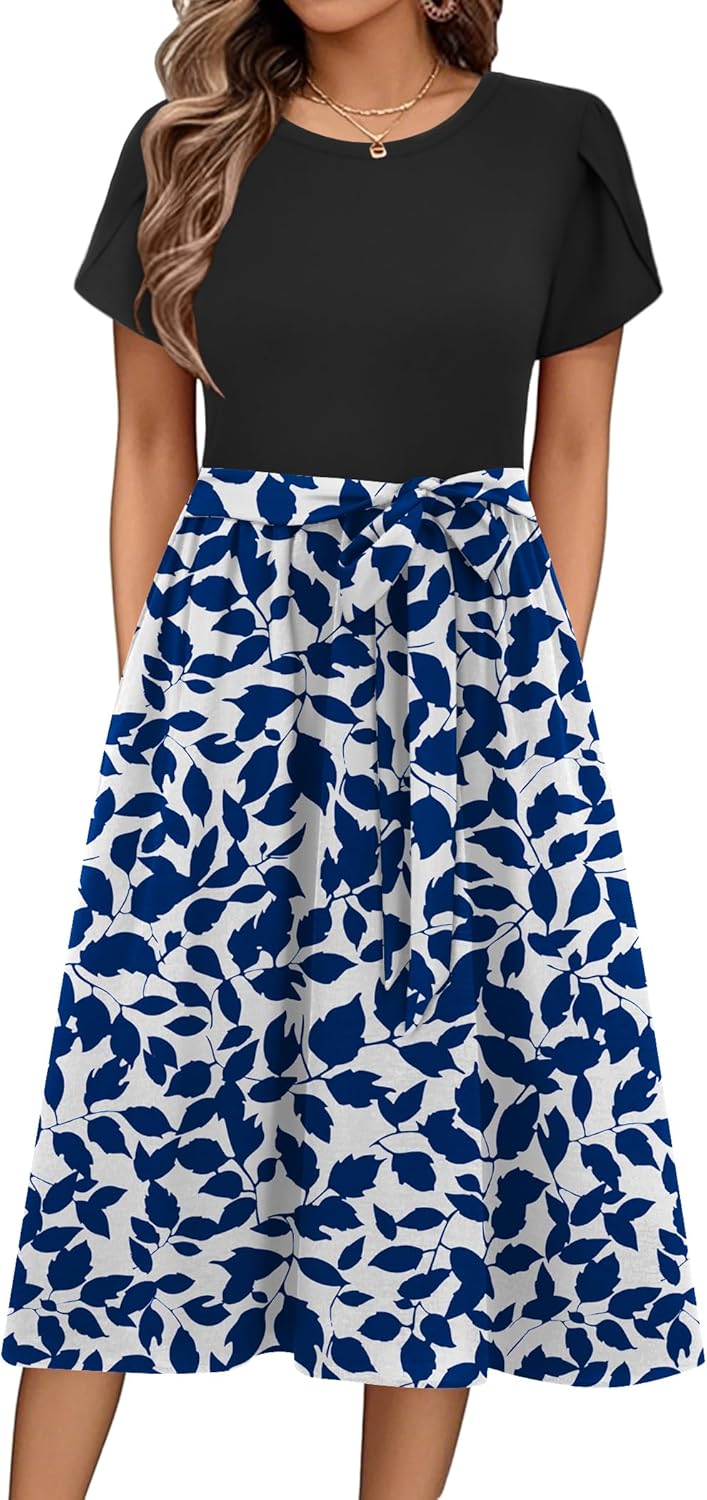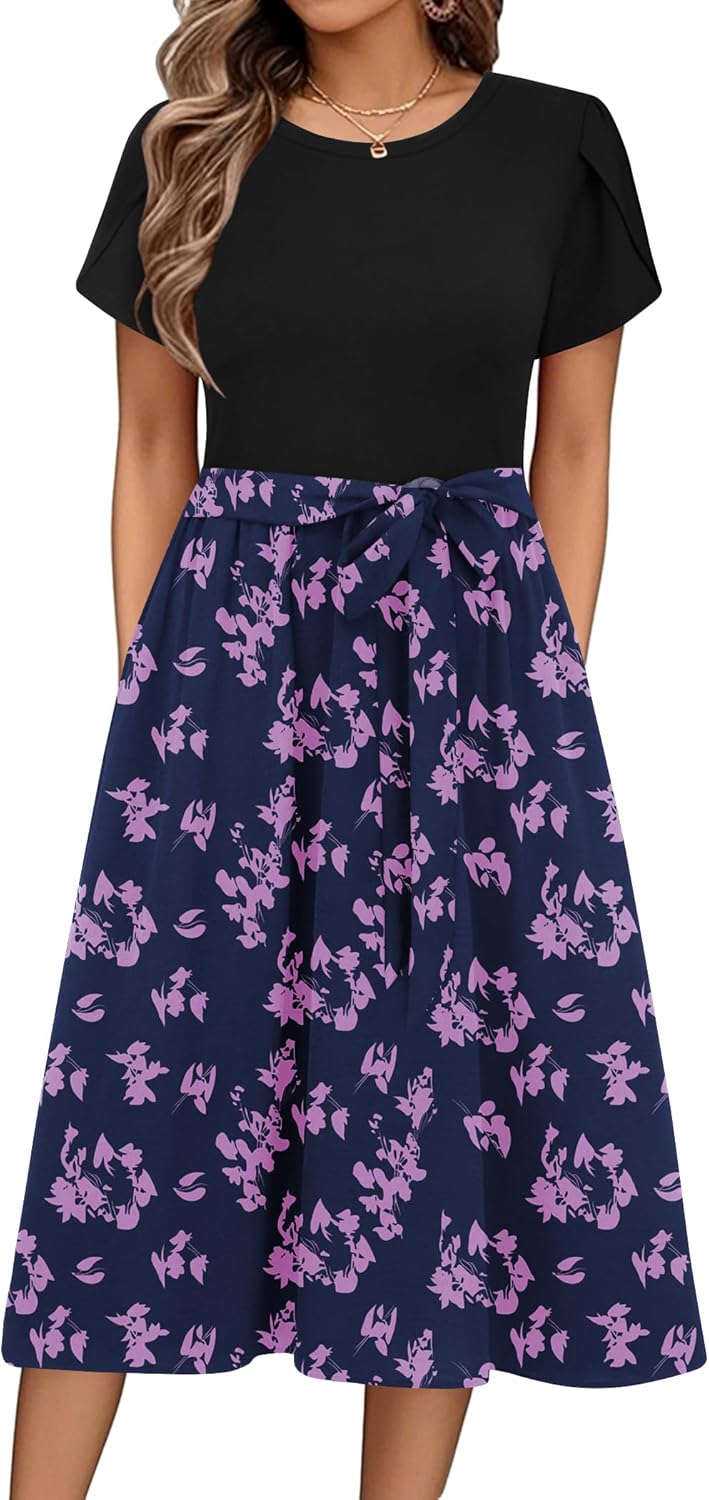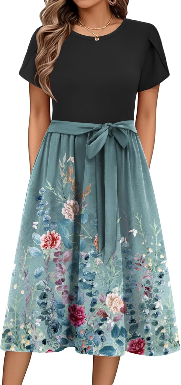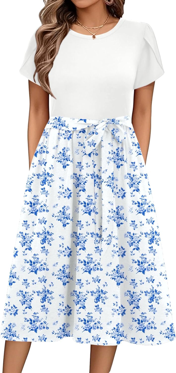 Zeagoo Womens Midi Dress Summer Short Sleeve Dress with Pockets 2025 Casual Floral T-Shirt Dress Flowy Beach Sundress