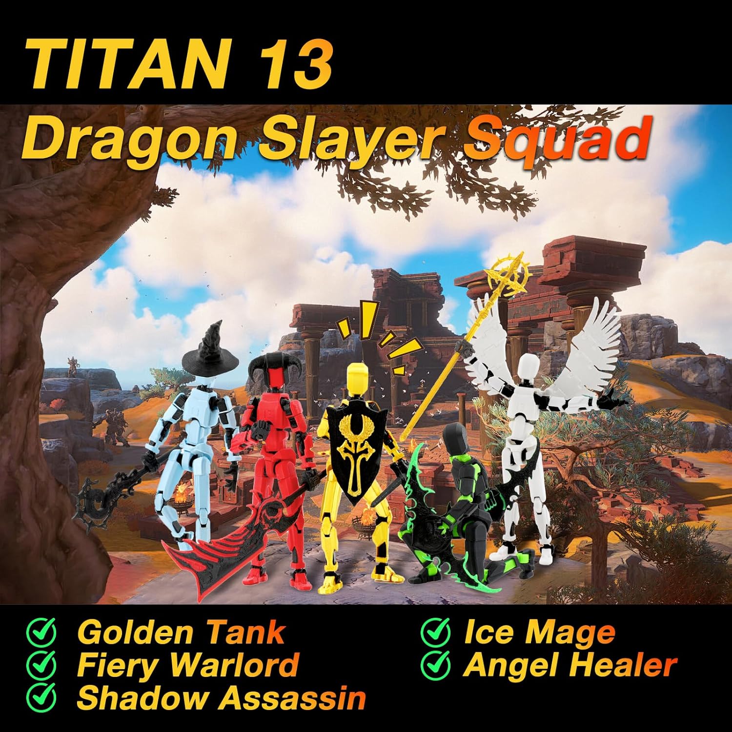 - 【Weapon Accessory Set】This Dragon Slayer Squad Dummy action figure set includes 5 different colors Titan 13 action figures, with Assassin's Dual Blades; Paladin's Shield and One-Handed Sword Set; Berserker's Dragon Slayer Blade, Bull's Horn Warrior Helmet; Mage's Staff; Mage's Hat; Angelic Wings; Angelic Scepter