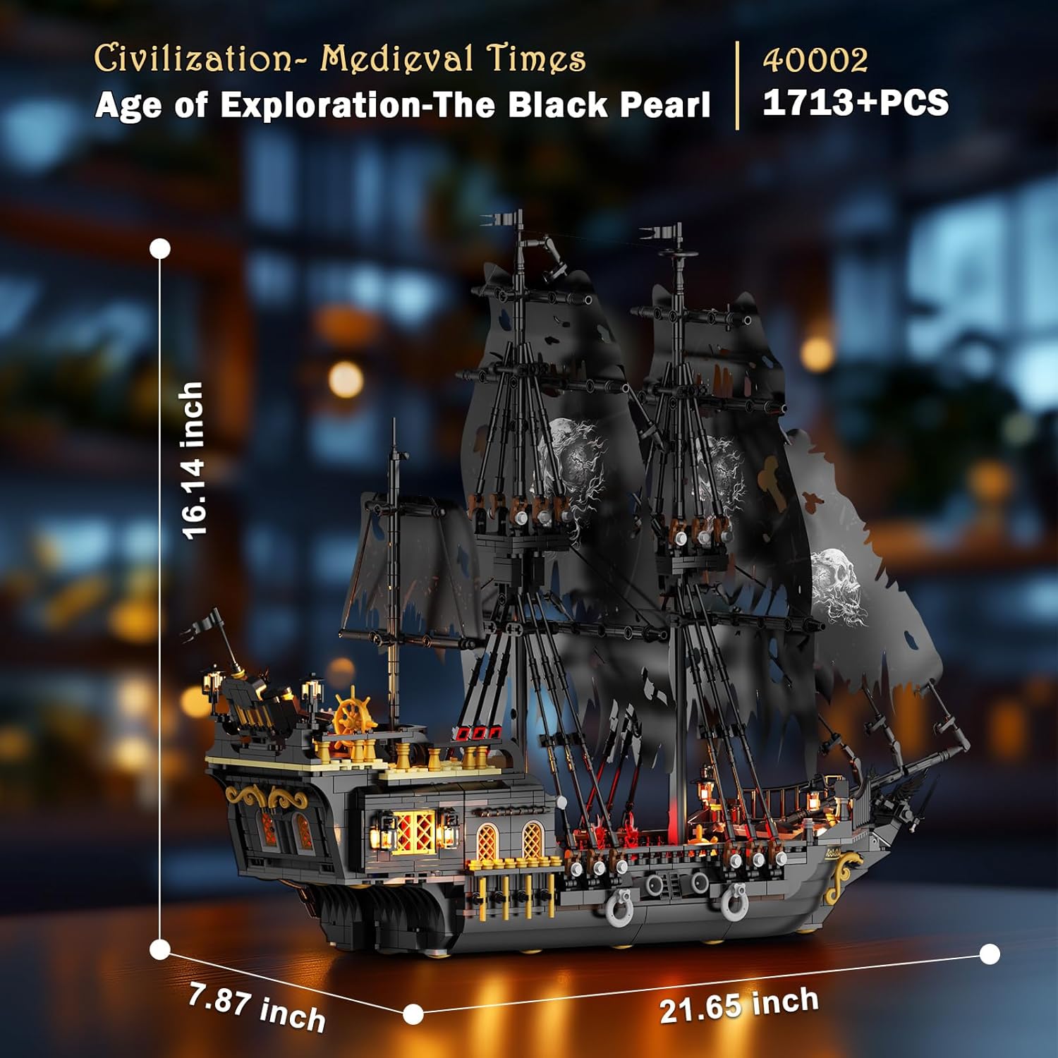 JMBricklayer Pirate Ship Building Toys with Lights, Pearl Pirate Ship Model Boat Kit 40002, Black Ship Toy Building Sets for Adult Teens 14+, Home Office Decor Valentines Gifts(1713 PCS) New Upgrade