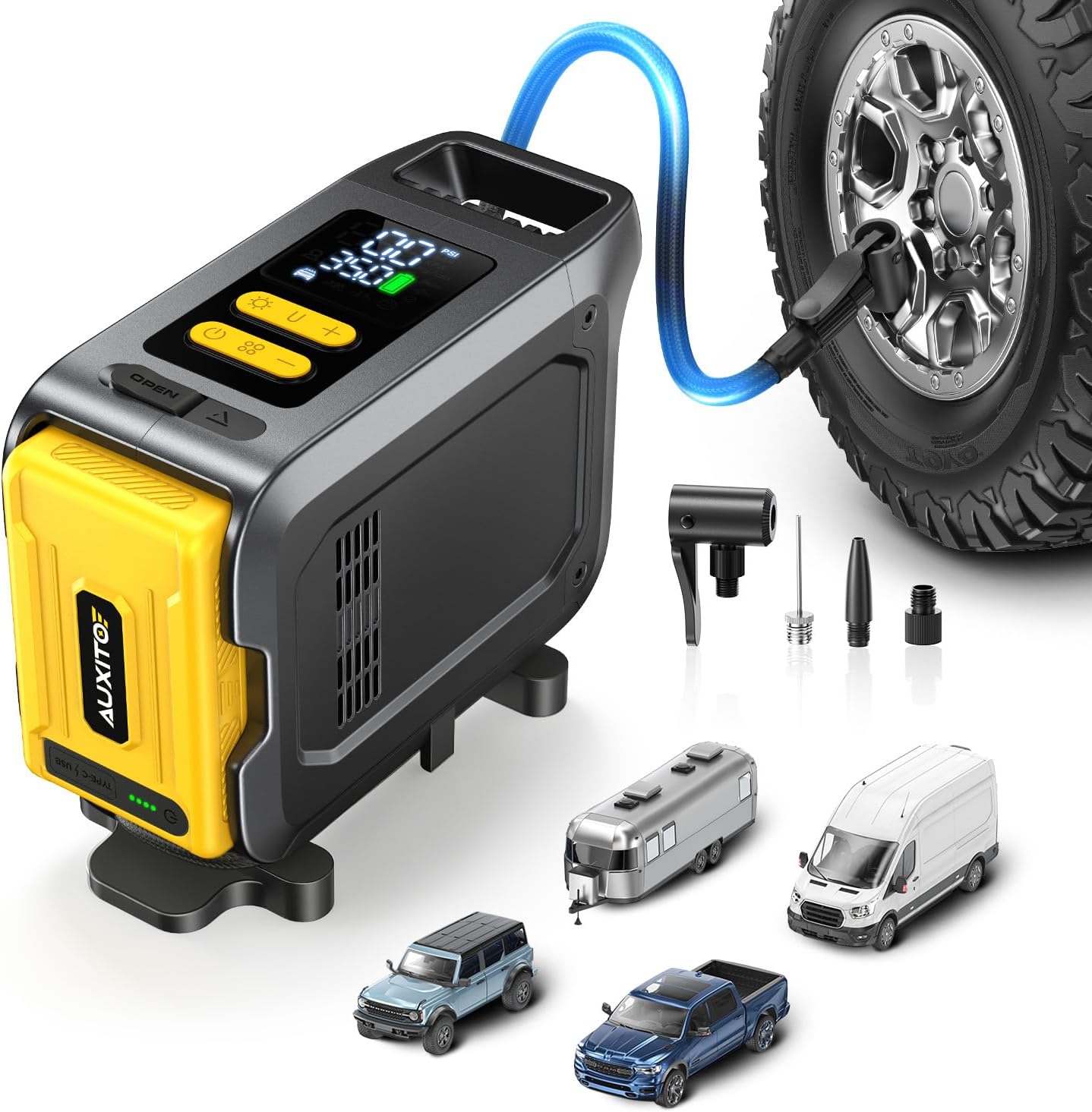 AUXITO AS1 Tire Inflator Portable Air Compressor - 150PSI Bike Pump 1Min Fast Inflate with Tire Pressure Gauge, 5200 mAh, LED Light, Car Accessories Air Pump for Auto, Moto, Bike Car Gifts for Men
