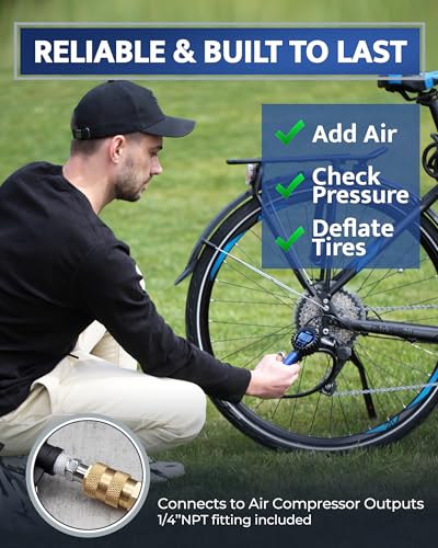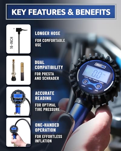 ONE PUMP FOR ALL YOUR BIKES – Works with both Presta and Schrader valves; no need for extra adapters; perfect for road bikes, mountain bikes & more KNOW YOUR EXACT PRESSURE – bicycle tire inflator gives precise 3-200 PSI readings in 0.1 PSI increments with ±2 PSI (1% FS) accuracy; big, easy-to-read display REACH EVERY VALVE EASILY – 16-inch hose gives you extra flexibility; better than short hoses on other bicycle pumps ALWAYS READY FOR ANY TIRE – Use it on bikes, motorcycles, SUVs, and even cars; the perfect air compressor attachment for presta valves CONTROL YOUR INFLATION – Adjustable pressure lever lets you inflate slowly or quickly; perfect for tubeless setups and fine-tuning your tire pressure