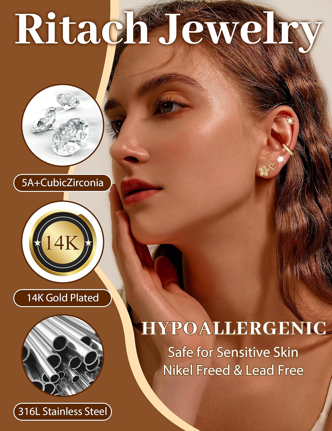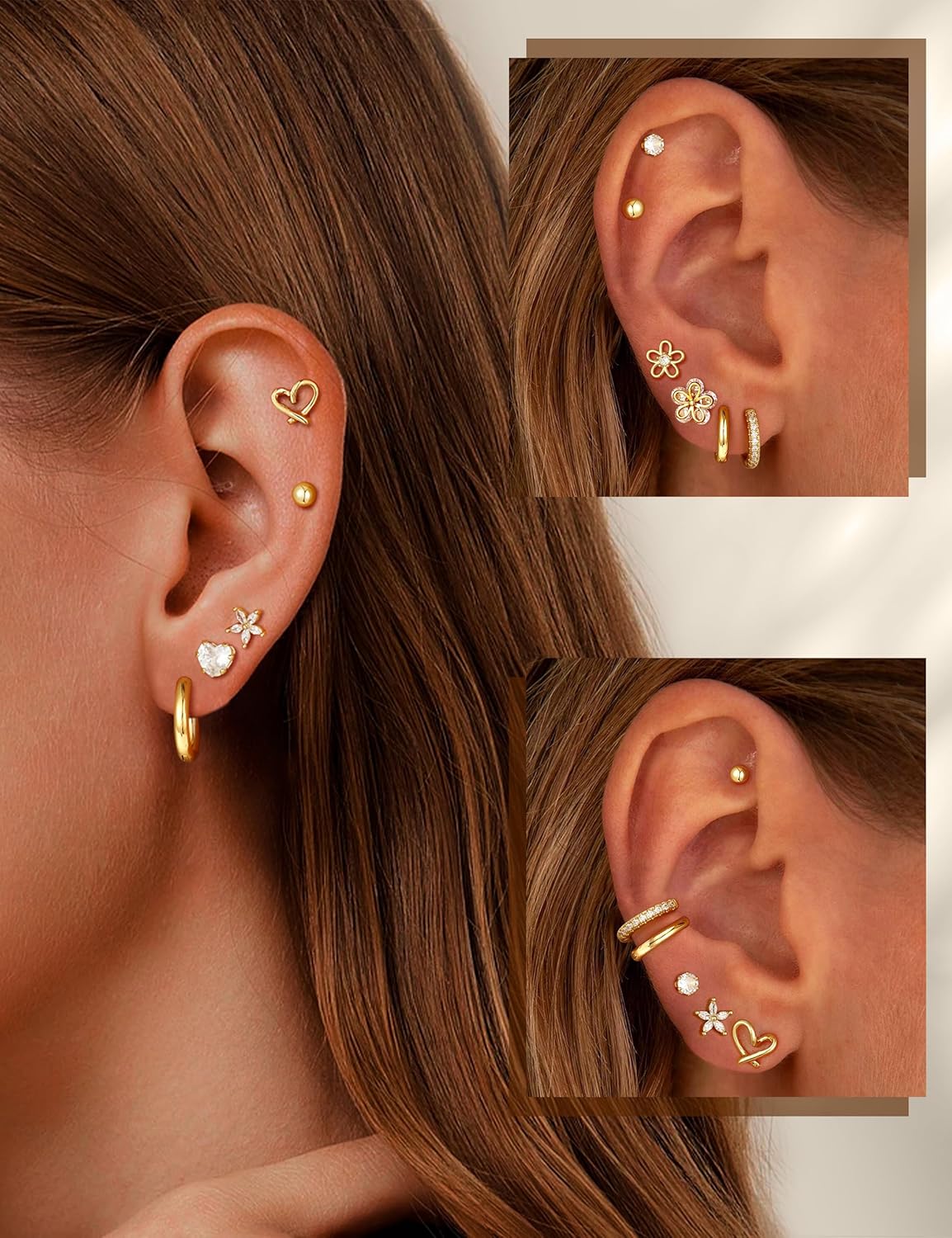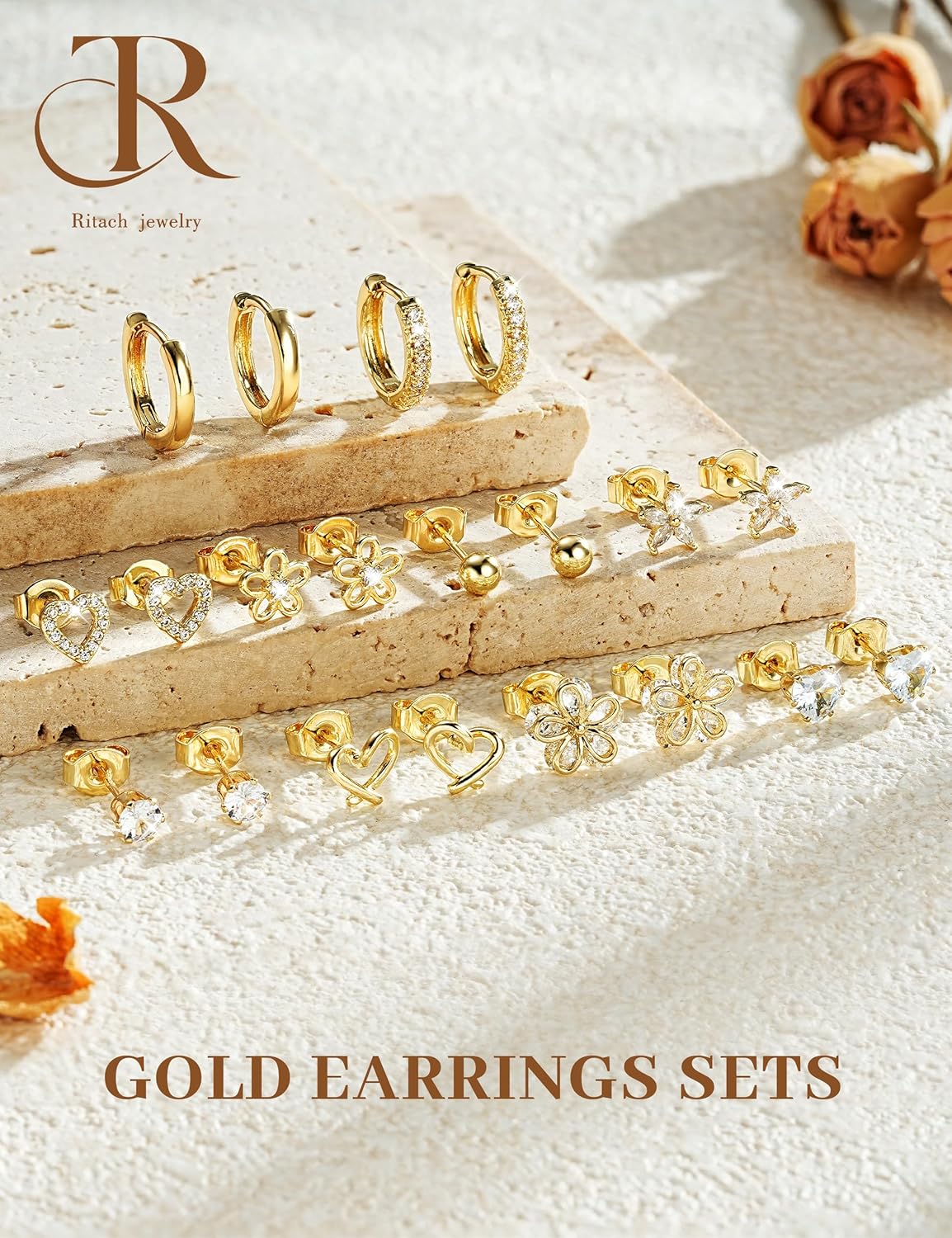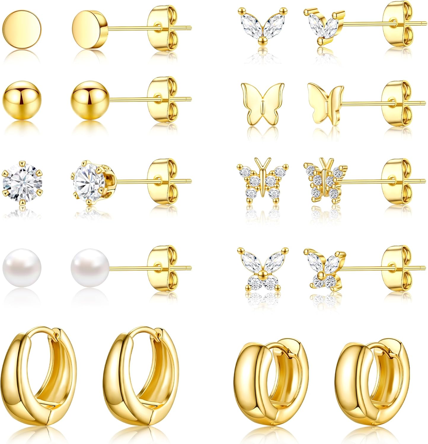 Small Gold Stud Earrings Set for Women - 14K Gold Plated CZ Huggie Hoops Hypoallergenic Earrings Dainty Flower Heart Stud Earrings for Jewelry Gift