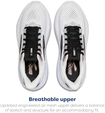 THIS WOMEN’S SHOE IS FOR: The Ghost 17 is for runners and walkers alike looking for an everyday companion that provides smooth, reliable comfort. Now featuring an extra 1mm of DNA LOFT v3 in the heel and 3mm in the forefoot to help every mile feel as good as the first. This Brooks Ghost 17 is a certified PDAC A5500 Diabetic shoe and has been granted the APMA Seal of Acceptance. The Ghost 17 is a certified carbon neutral product. Predecessor: Ghost 16. SOFT & DYNAMIC CUSHIONING: The Ghost 17 offers neutral support with premium nitrogen-infused DNA Loft v3 cushioning to deliver lightweight softness and feel-good comfort after every mile. Ideal for road running, walking, cross training, travel, and the gym. SMOOTH TRANSITIONS: The newly designed midsole incorporates precise flex grooves that enhance the shoe's ability to promote smooth transitions. This innovative feature allows for a more natural flow during toe-off, enabling runners to maintain speed and momentum with ease. COMFORT & BREATHABILITY: The double jacquard air mesh upper provides premium comfort and breathability, while the kick-back collar adds support and structure. This design ensures optimal airflow, keeping your feet cool and dry during intense activities, while adapting to your foot’s natural movements for a comfortable snug fit. RUBBER OUTSOLE: The innovative rubber compound, crafted with recycled silica, offers a perfect balance of durability, lightweight performance, and responsive rebound, making it ideal for any terrain.