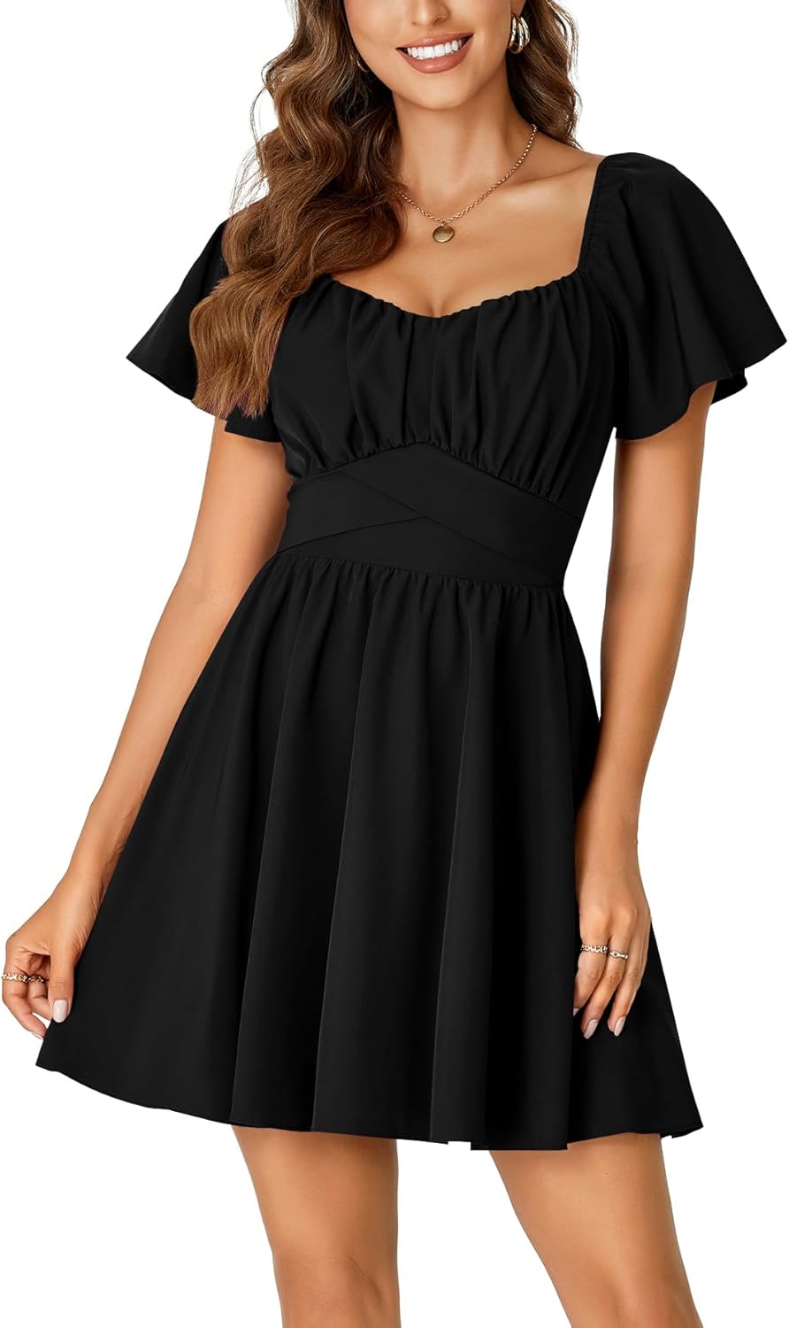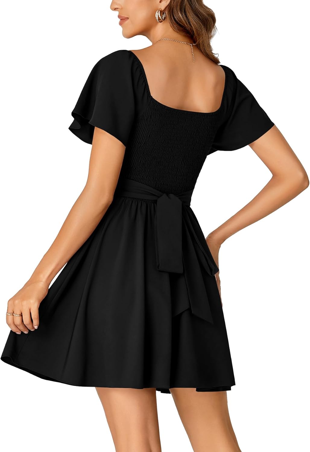 Rooscier Women's Tie Back Square Neck Wrap Ruffle Short Sleeve Flare Mini Dress
