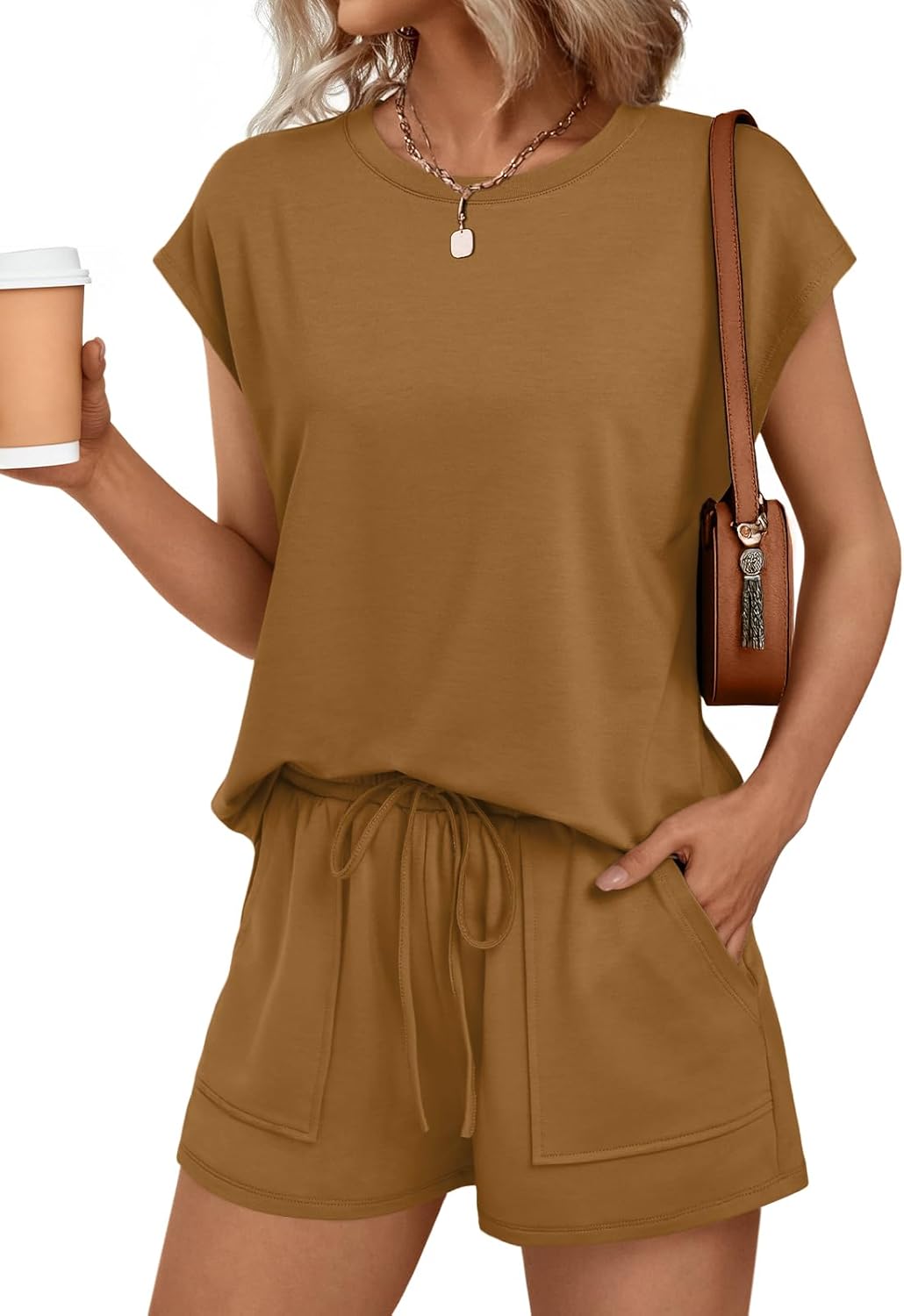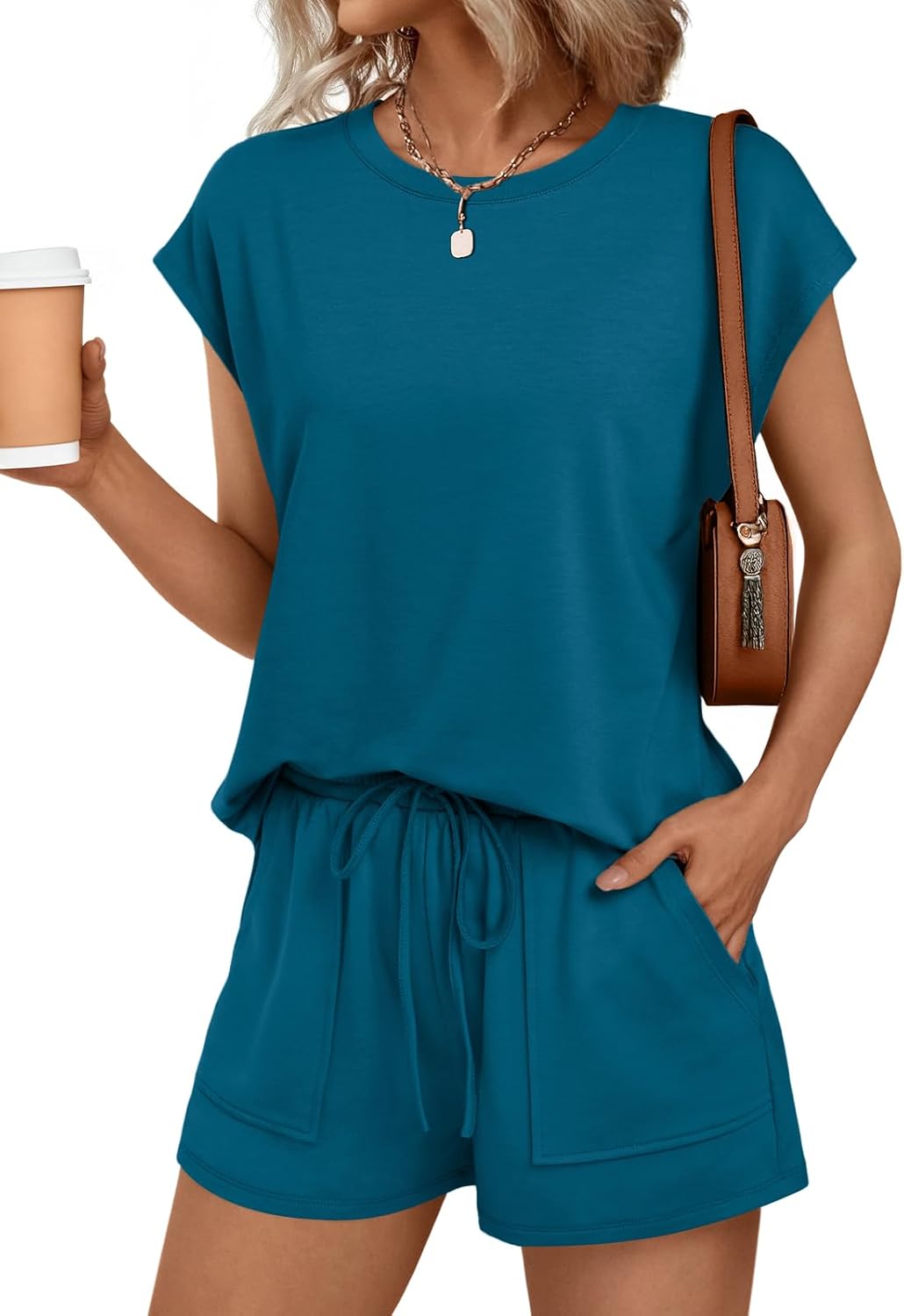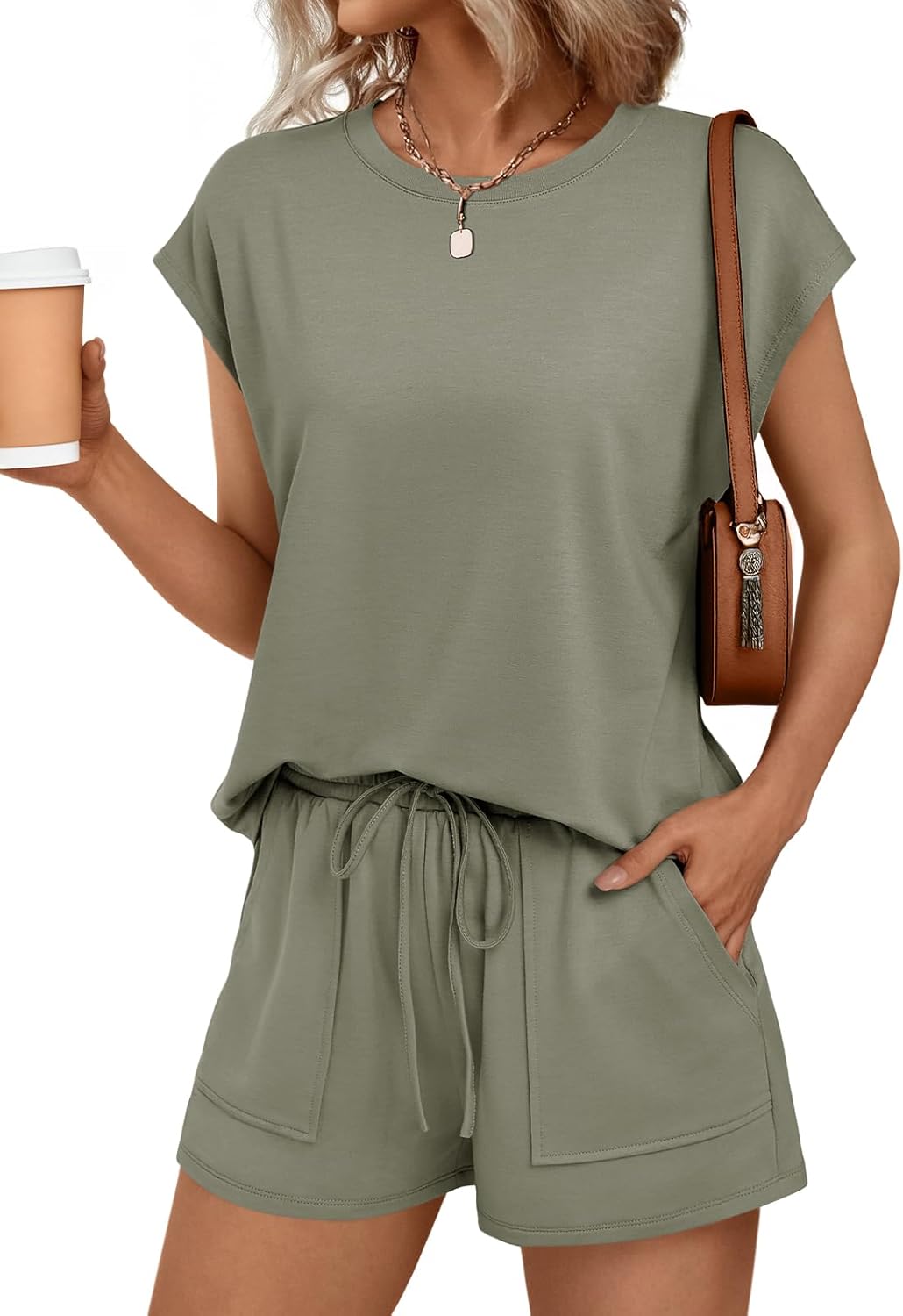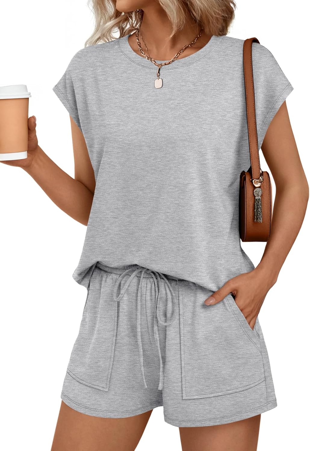 AUTOMET Womens Crew Neck Two Piece Short Sets Cap Sleeve Drawstring Summer Sweatsuit with Pocket