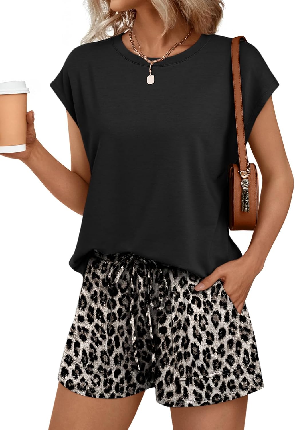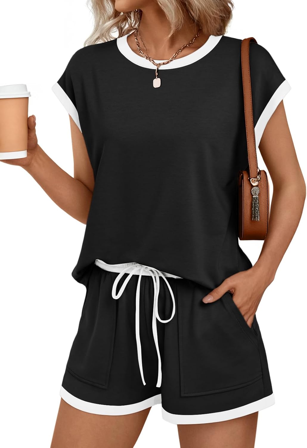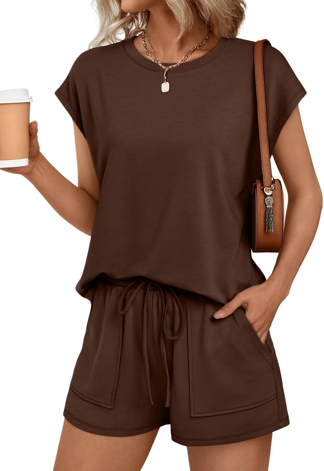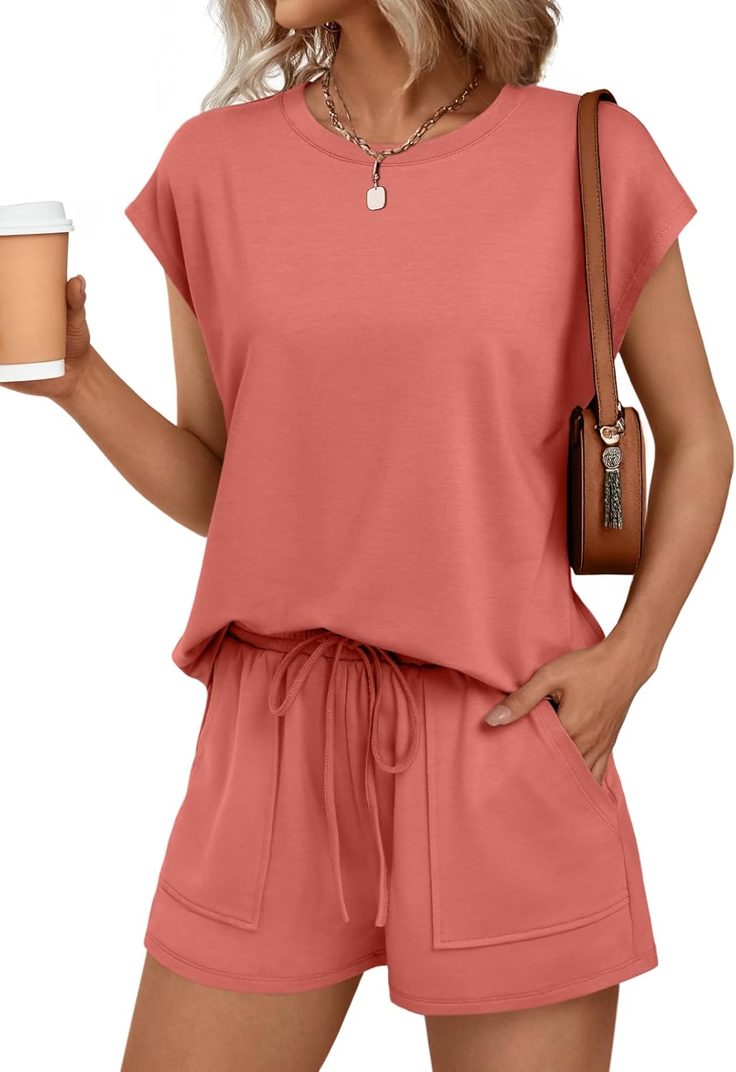 AUTOMET Womens Crew Neck Two Piece Short Sets Cap Sleeve Drawstring Summer Sweatsuit with Pocket