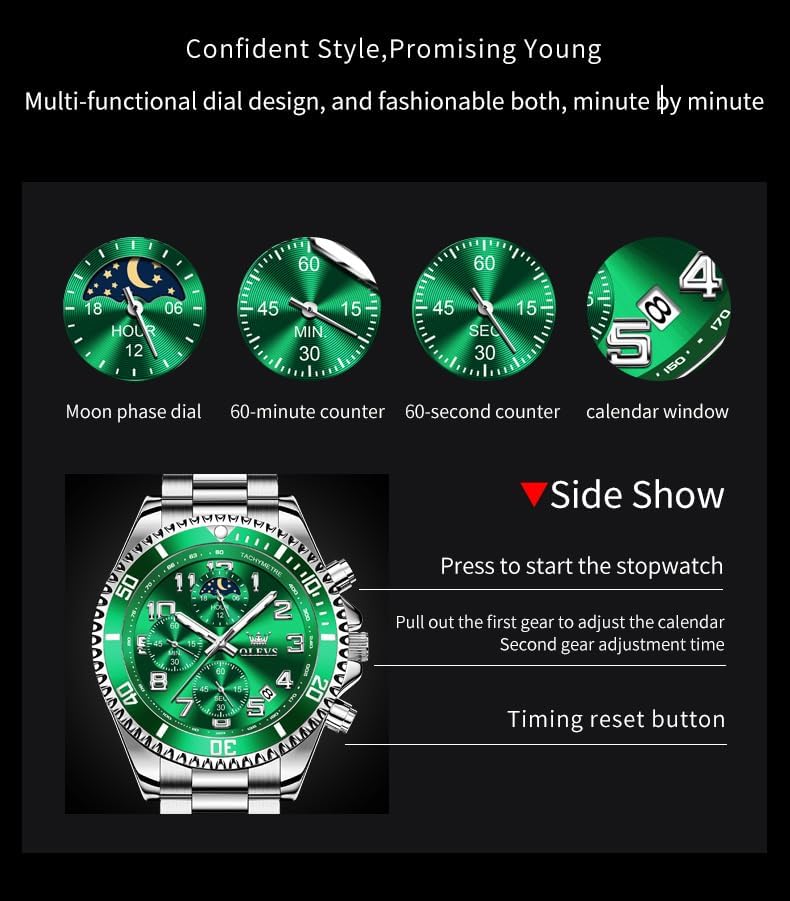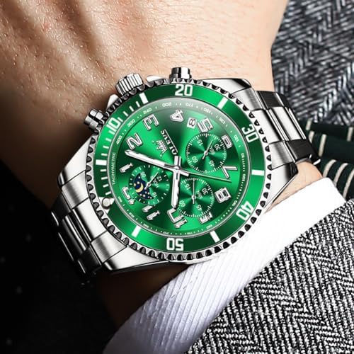 Modern Green Dial & Silver Aesthetic:Featuring a vibrant green dial paired with a polished silver-tone finish, this mens watch captures the latest fashion trends. Suitable for business meetings or casual social events, it adds a unique, sophisticated touch to any adult man's style Chronograph & Date Function:Equipped with three sub-dials for 1/10 second, minute, and second tracking, this chronograph watch ensures accurate timing. The analog display includes an easy-to-read date window at 3 o'clock, helping busy professionals stay organized easily Durable Stainless Steel & Personalized Fit:Crafted with a 20mm (0.79") silver stainless steel band and a 41mm (1.61") case. The 11mm (0.43") thickness provides a masculine profile. We include an adjustment tool for the link bracelet to ensure a secure, comfortable fit for all-day wear 3ATM Waterproof & Luminous Enhanced Visibility:Rated 3ATM waterproof against rain, splashes, and hand washing. The luminous hands and hour markers are designed for clear readability in low-light environments, making it a reliable accessory for late-night events, theater outings, or travel Sophisticated Gift Choice for Milestones:Presented in a premium gift box, this green dial watch is a versatile choice for Father’s Day, graduations, or anniversaries. It is a reliable gift for husbands, fathers, or partners who appreciate a blend of bold color and timeless design