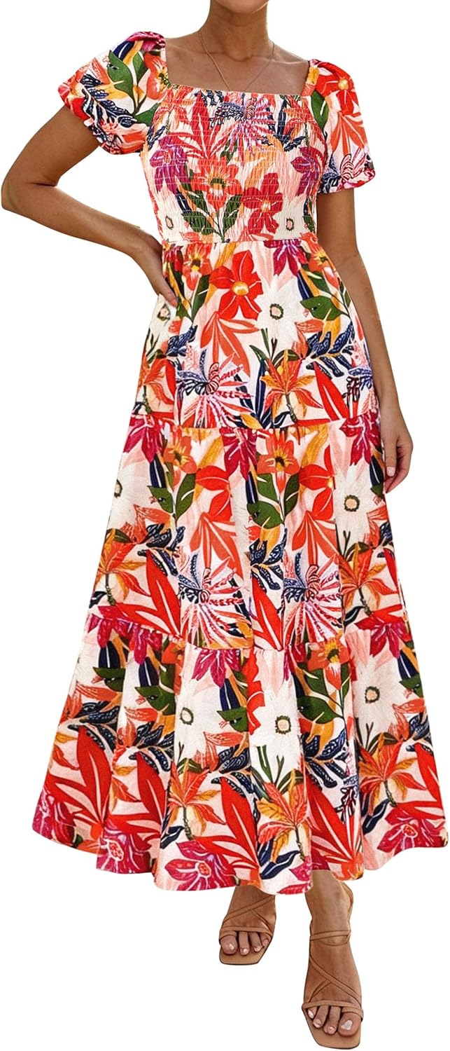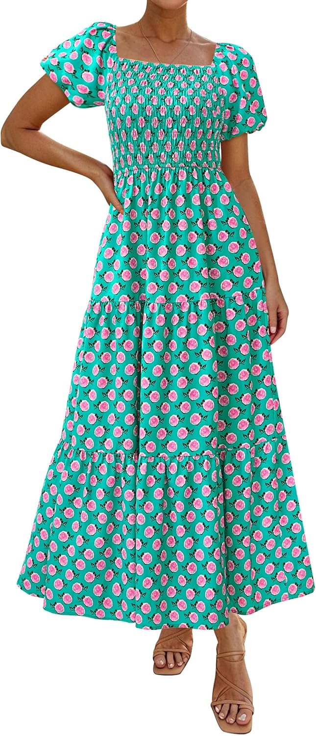 PRETTYGARDEN Womens Summer Puff Short Sleeve Maxi Dress Square Neck Smocked Tiered Ruffle A Line Long Flowy Beach Dresses