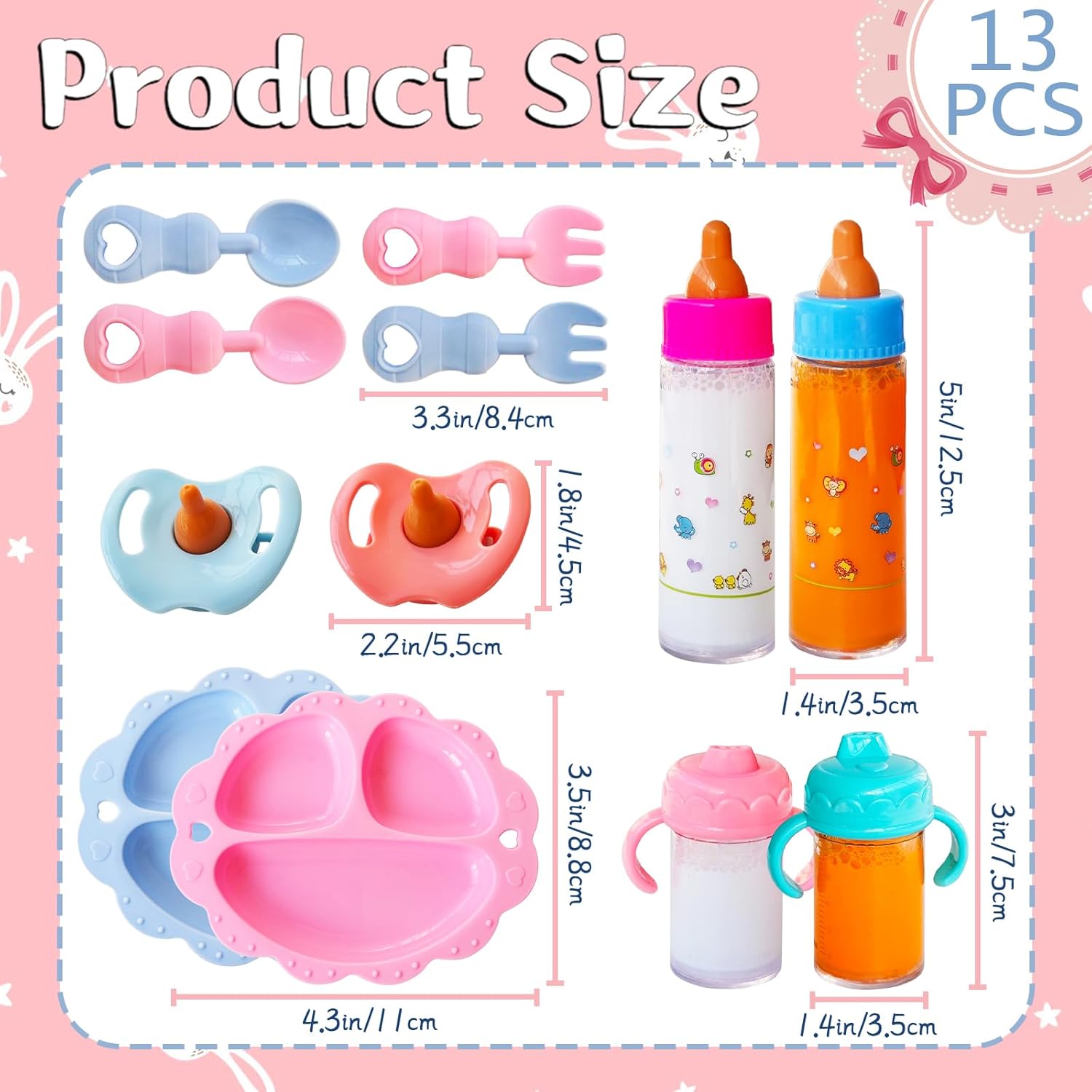 13 Pcs Baby Doll Accessories Magic Bottle Set,Pretend Play Feeding Toy Set with Package,Doll Feeding Set for Kids Girls,Magic Disappearing Juice Milk Bottles,Sippy Cups,Pacifiers,Bowl Spoons