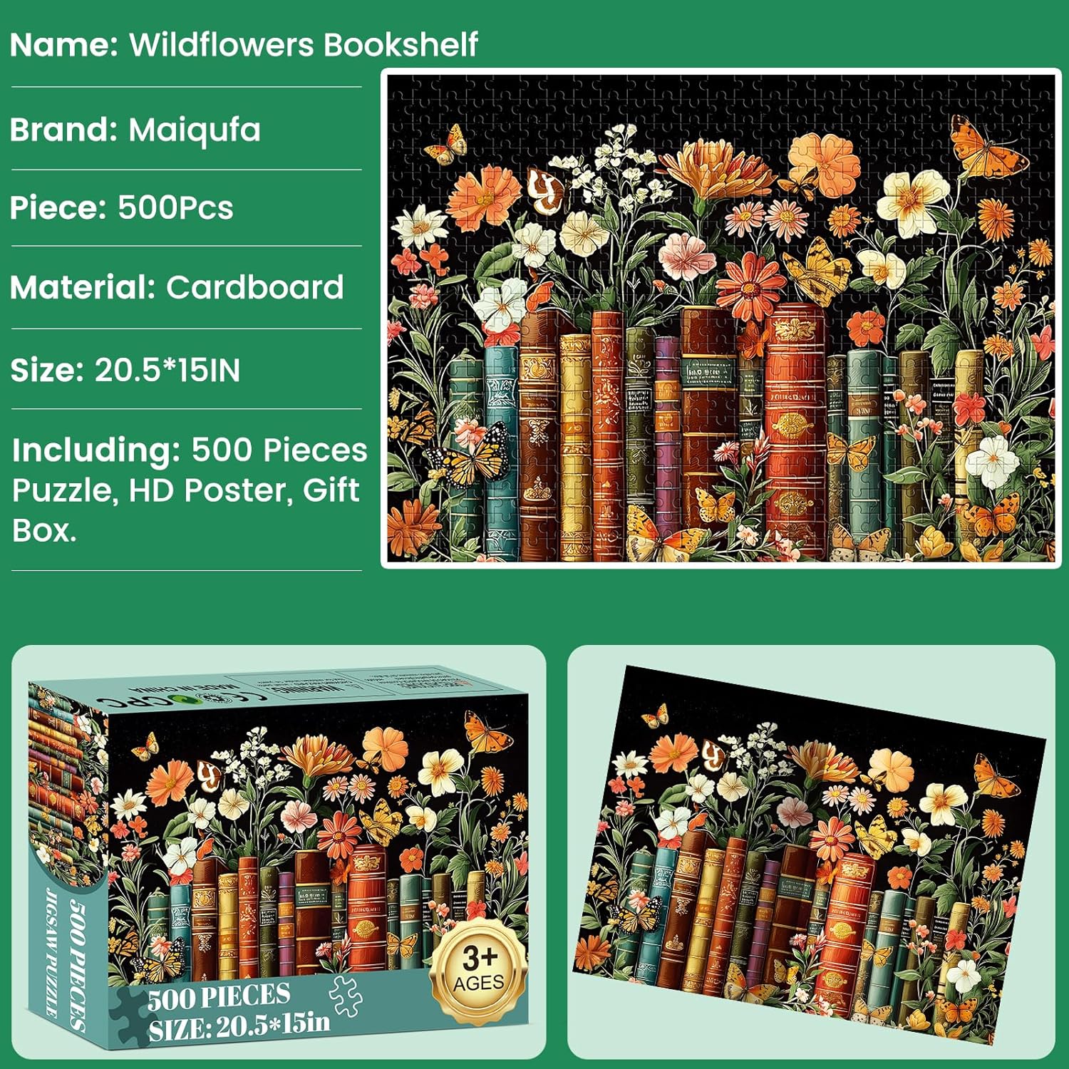 500 Piece Puzzle for Adults | Vintage Wildflowers Books Puzzle | Recycled Cardboard Plant Flowers Jigsaw Puzzle 500 Pieces | Challenging Game Home Decor Birthday Party Gift Toy for Adults Seniors