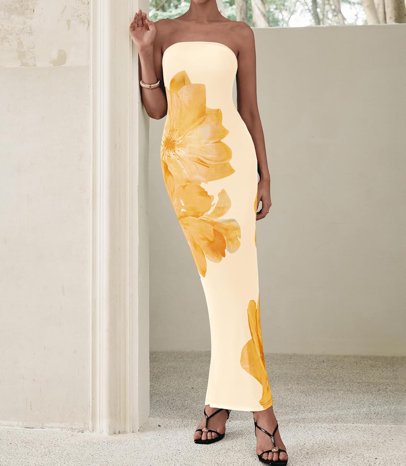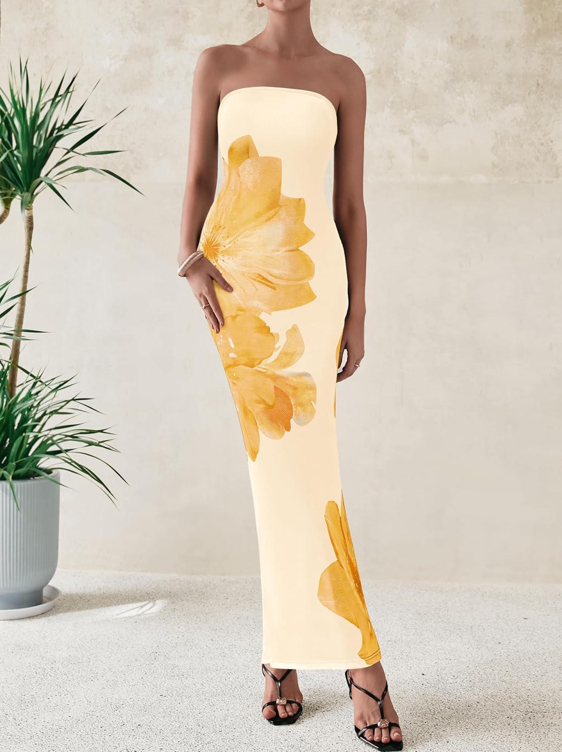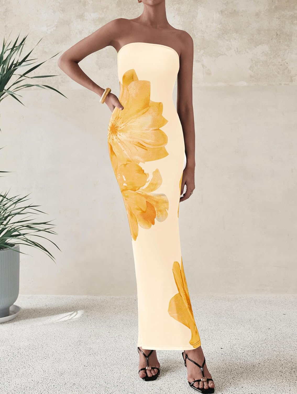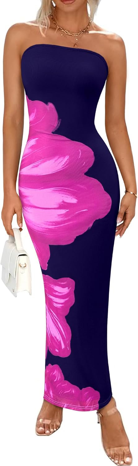 PRETTYGARDEN Women Summer Strapless Maxi Dress Bodycon Floral Sexy Long Wedding Guest Dress Formal Tube Mesh Cocktail Dresses