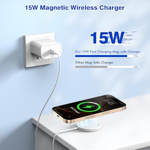 15W Portable Wireless Charger iPhone:with a 20W USB C Power Adapter,the Apple magnetic charger for iPhone supports up to 15W fast magnet charging speed for your iPhone 16/iPhone 15/iPhone 14/iPhone 14/iPhone 12 Series,fast charging your iPhone 14 to 50% in just 30 minutes and from 0 to 100% in just 2-2.5 hours, 3X faster then the original 5W iPhone Charger Magnetic Charger for iPhone 16/15/14/13/12 Series:This iphone magnetic charger supports up to 15W fast magnet charging speed for your iPhone 16 Pro Max/16 Pro/16/16 Plus/15 Pro Max/15 Pro/15/15 Plus/14 Pro Max/14 Pro/14/14 Plus/13 Pro Max/13 Pro/13/13 Mini/12/12 Pro/12 Mini/12 Pro Max and AirPods 4 3 2 Pro.Note:Magnetic iphone charging pad is supported with no case or mag-safe case,a normal case is not supported Magnetic,Stable 360° Adsorption Mag Safe Charger:Magnetic iPhone Charger firmly holds your iPhone while charging,no sliding or falling off, provides you a fast,safe and charging experience.The iPhone wireless charger fast charging pad features auto-alignment technology and a robust magnetic hold to ensure that your iPhone stays securely in place while charging 6FT Safe and Fast Apple Wireless Charger:this magnetic wireless charger iPhone pad is better at heat dissipation,the iPhone magsafe charger with built-in smart chip provides over-current,over-voltage,short-circuit,over-temperature and other protection to protect your phone battery from damage,this iPhone charging pad supports charging iPhone/AirPods, but DO NO SUPPORT Apple watch charging 20W USB C Block & 6FT Cable & Apple magsafe charger:The Package includes 1Pack 15W magnetic iPhone charging pad with 6FT/1.8m/6foot Charging Cable,1Pack 20W iPhone 16 USB C Charger Block.If there is any issue while using the mag-safe charger,welcome to let us know. Notice: make sure your device supports wireless charging technology, and DO NOT USE the wireless charger in high temperature environment just in case the charger pad will stop charging