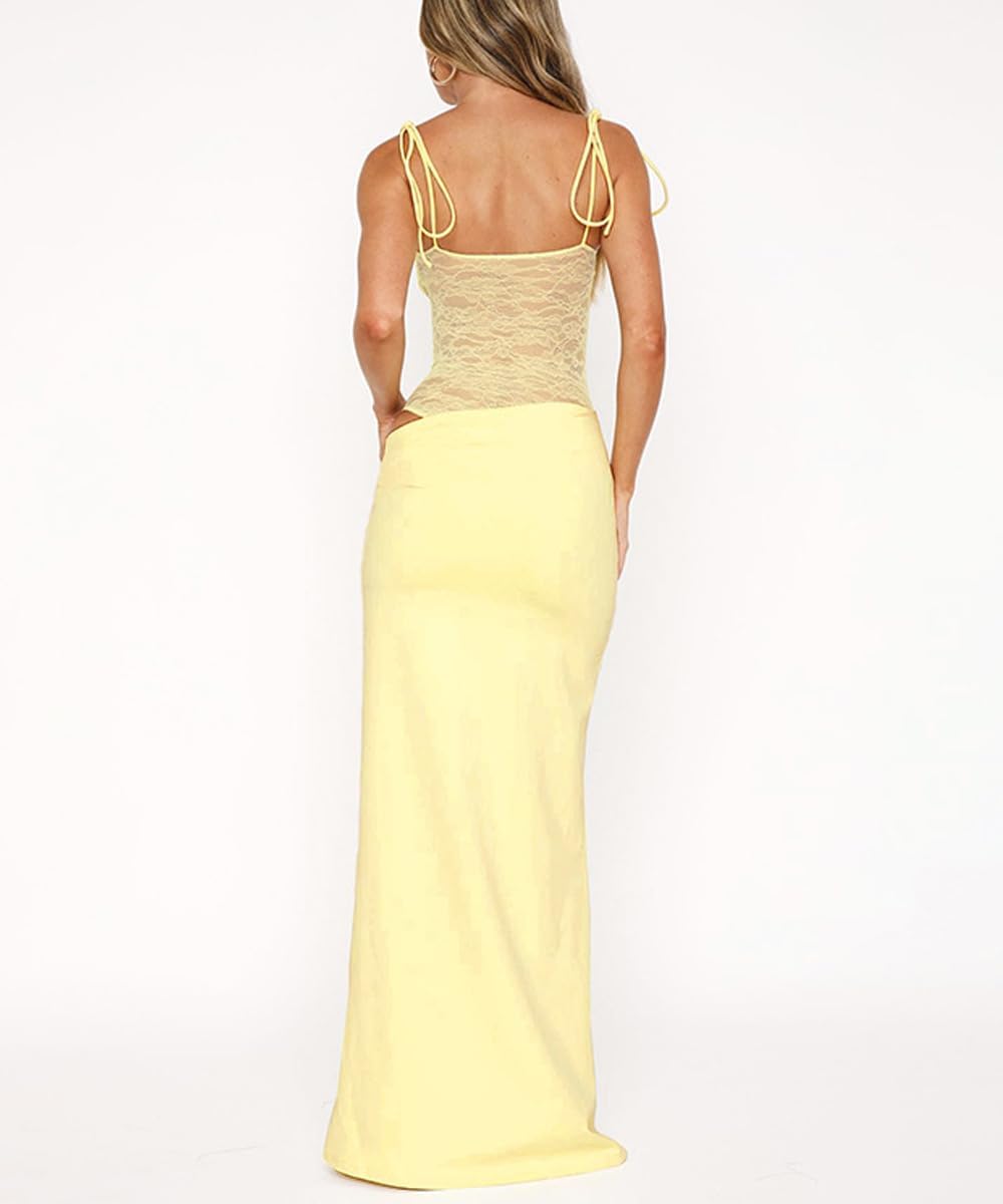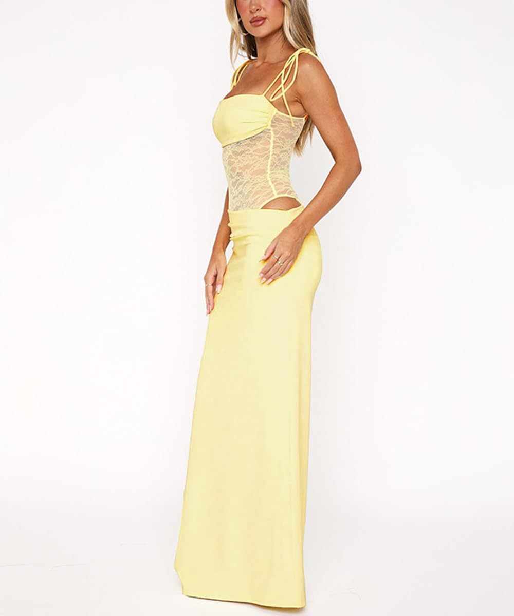 GRMLRPT Women Sexy Lace Patchwork Maxi Dress Spaghetti Straps Y2K Sheer Long Bodycon Club Cocktail Long Dresses