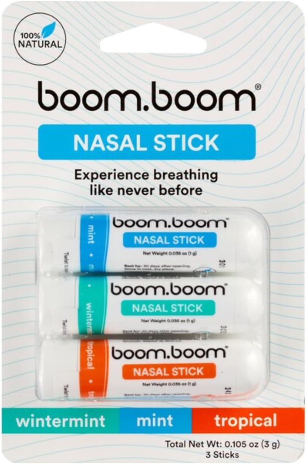 BoomBoom Nasal Stick | Vapor Flow Technology | Cool Refreshing Sensation | Natural Mood Boost | Simple Ingredients | Essential Oils + Menthol Inhaler (Mint, Wintermint, Tropical, Spearmint)
