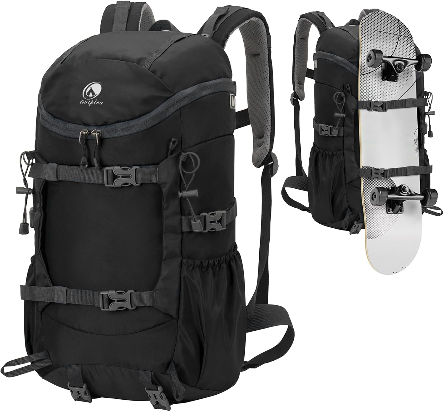 30L Skateboard Backpack Information Fabric: Oxford Cloth Weight: 1.2lbs Capacity: 30L Dimensions: 19.2"*11"*7.5" Target user: Unisex Used for: Skateboard Sports Outdoor Hiking Traveling Number of exterior pockets One front zippered pocket One main zippered pocket Two side pockets One top pocket Features 1. The fabric is scratch-resistant, wear-resistant and water-resistant 2. 2L hydration bladder can be placed 3. The straps are reinforced with stitches 4. The back and the shoulder strap are filled with 3D sponge 5. The chest strap and the waist belt can be adjusted 6. The chest strap buckle has an emergency whistle 7. Trekking poles can be placed in the front, and sleeping bags can be placed in the bottom buckle 8. Elastic bands are on the sides and front 9. Outer webbing is on the top